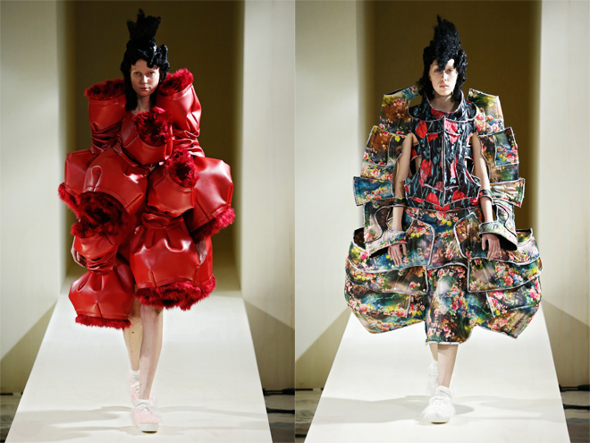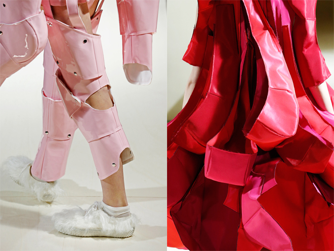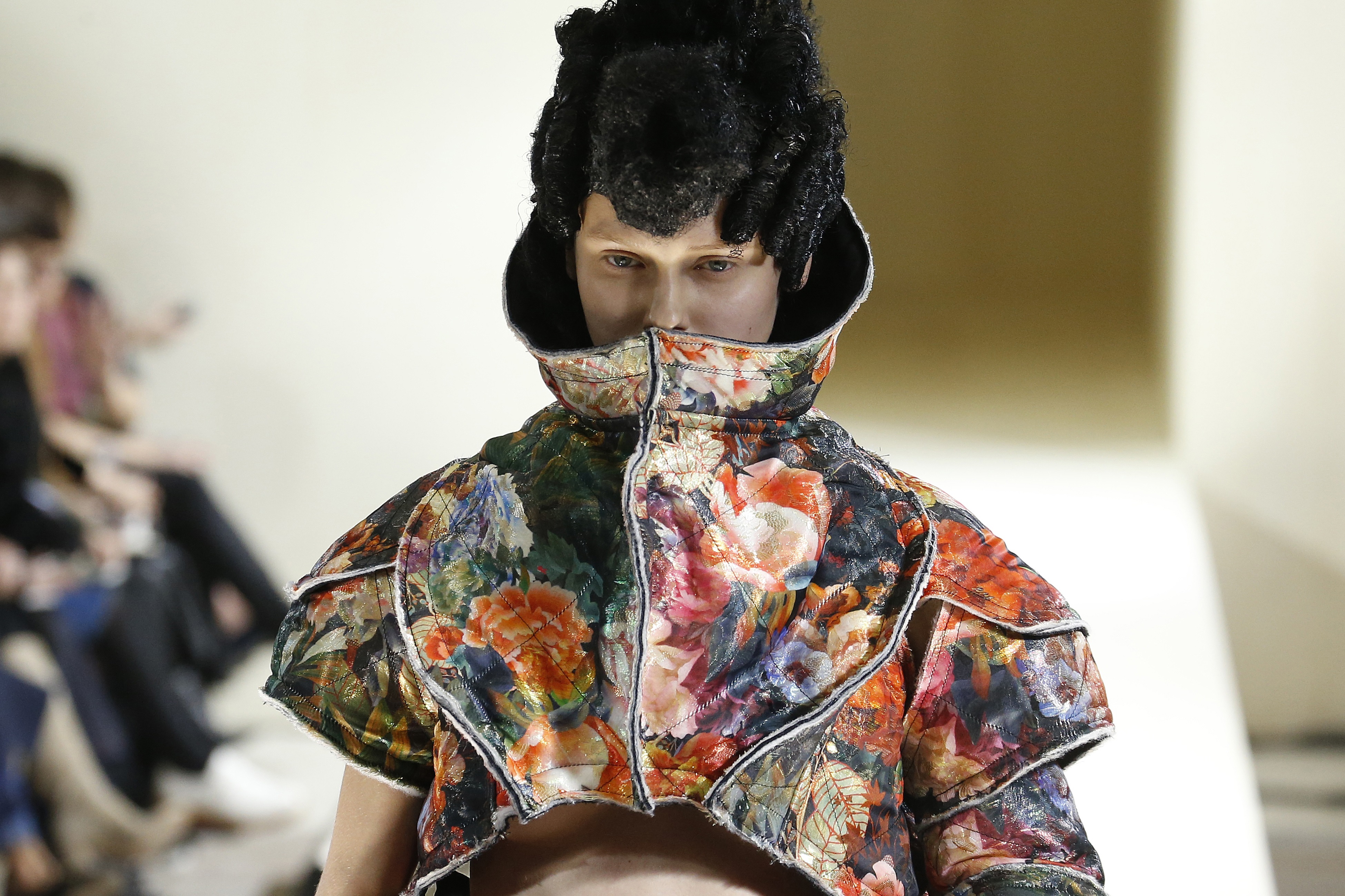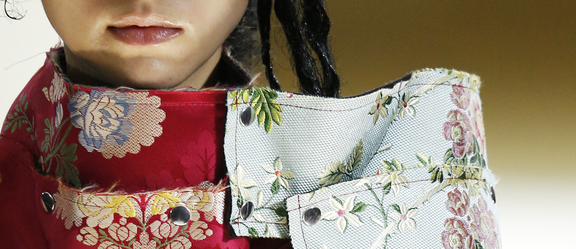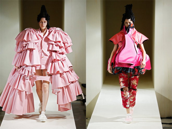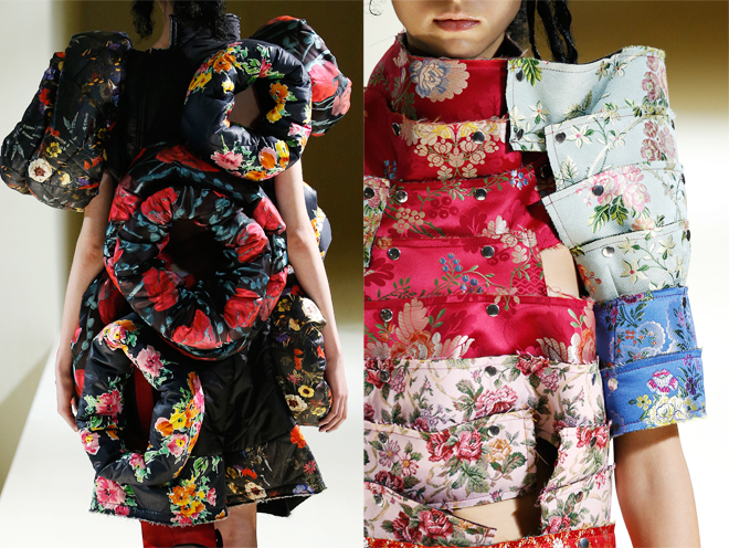 西洋絵画での花園のように鮮やかな花柄の甲冑スタイル、つぼみや花弁を思わせる大きなパーツが連なったドレス、ピンクのラバー素材が大胆にフリルをなすジャケット……。カラーパレットは暖色系が中心で、花と甲冑、ハリ感のある素材とキルティングなど、剛柔あわせ持つスタイルを見ると、今を生きる女性の強さはどうあるべきかを考えさせられる。