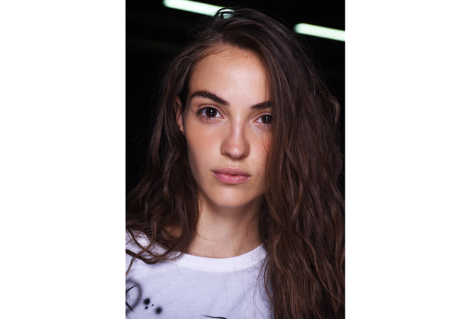 メークもビーチガール風の気楽でフレッシュな印象。太陽でほんのり灼けた頬を演出するチークを強調すべく、眉はブリーチ、唇も肌色コンシーラーでカラーレスに。何人かのモデルは髪もプラチナブロンドにブリーチされて、70年代のサーファー風に変身した。