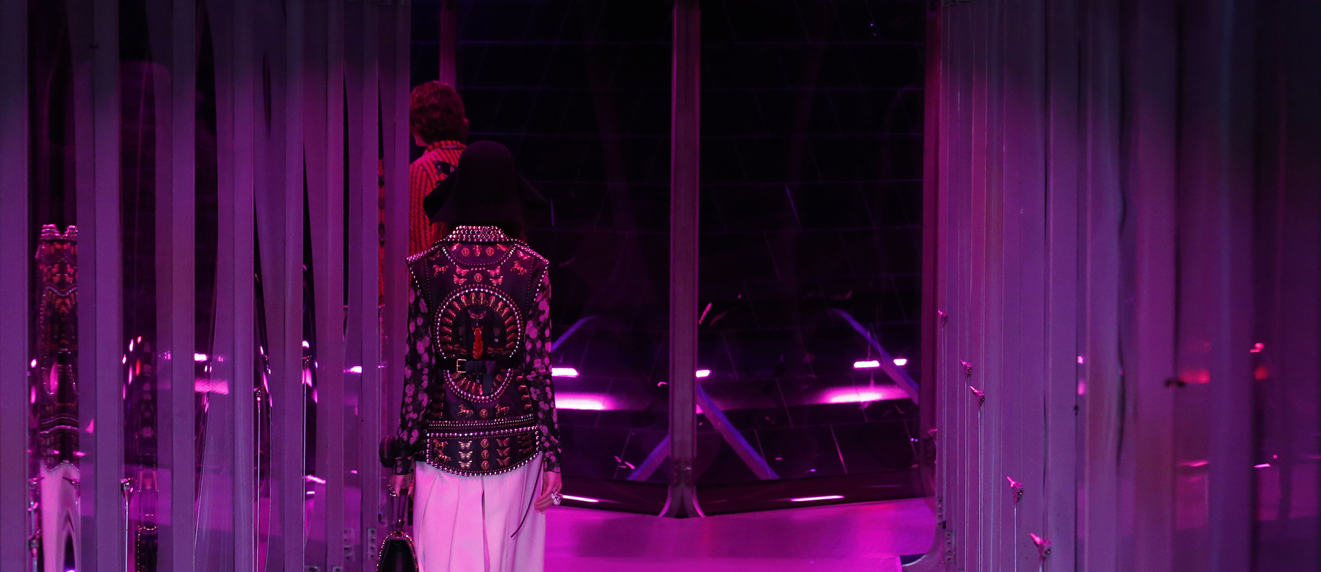 ランウェイをチューブとしたアイデアの裏には、混沌とした不思議な庭をそぞろ歩くモデルたちのイメージがあるという。チューブ中央にそびえ立つのは風見鶏を頂点とした紫色のピラミッド。