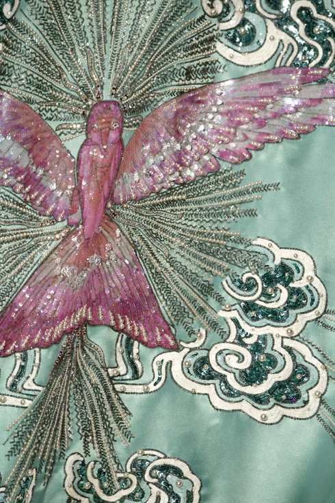 今季もレディースルックの半分以上がロングスカート。ボウタイや白襟などモチーフもレトロでエレガントな印象が強い。レトロとはいっても、豪華な刺繍やスパンコールがやり過ぎと思われるほど施され、贅沢でカラフルな素材を使い、鮮やかな柄を組み合わせたり、服の脇役に収まらない個性派ベルトやバッグ、印象的なタイツにシューズをコーディネートするなど、全体としてはアバンギャルドと言えるほどデコラティブだ。
