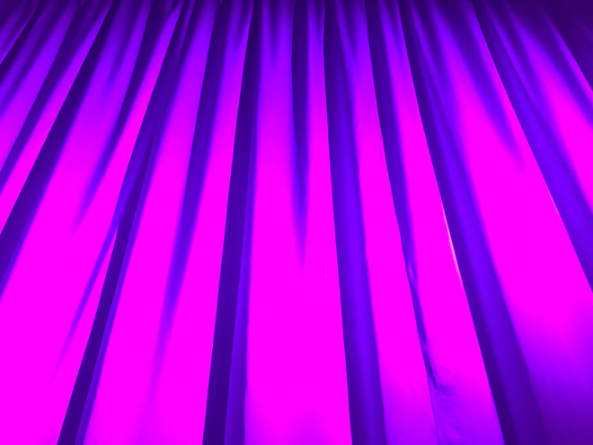 ピンクみがかった紫のライトに照らされた薄暗い会場を、案内係に導かれて進み、座ったシートの目の前には、高い天井から垂れ下がる厚地の緞帳。前回までと同様、ランウェイの片側だけに客席を設けたスタイルかなと思いながら開幕を待つ。
