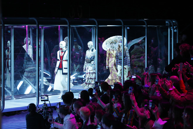 開始予定時間から30分ほど遅れドラマチックな音楽とともに幕が上がってびっくりしたのは、向こう側にも人がいたこと。細いチューブのようなランウェイを取り囲むように座席が用意されていたというわけだ。