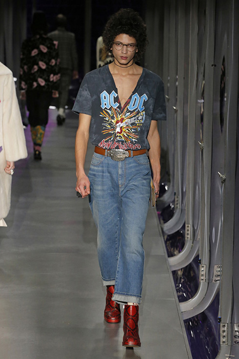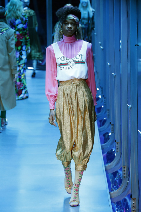 デザイナーによっては、毎季全く違ったイメージで驚かせるタイプもいるが、ミケーレの場合はシーズンごとの移り変わりが緩やかで、まるでどんどん続く絵巻物を見ているよう。美しい色使いと柄の組み合わせによるグッチ流の華やか、かつやや奇妙な世界観はそのままで、季節を追う毎に少しずつ新しいモチーフが付加される。今季はパワーショルダージャケットや、エアロビクススタイル、メタル系ロックファッションなど80年代要素がプラスされた。ヘアもちょっとレトロに作りこんだエイティーズスタイルが多い。