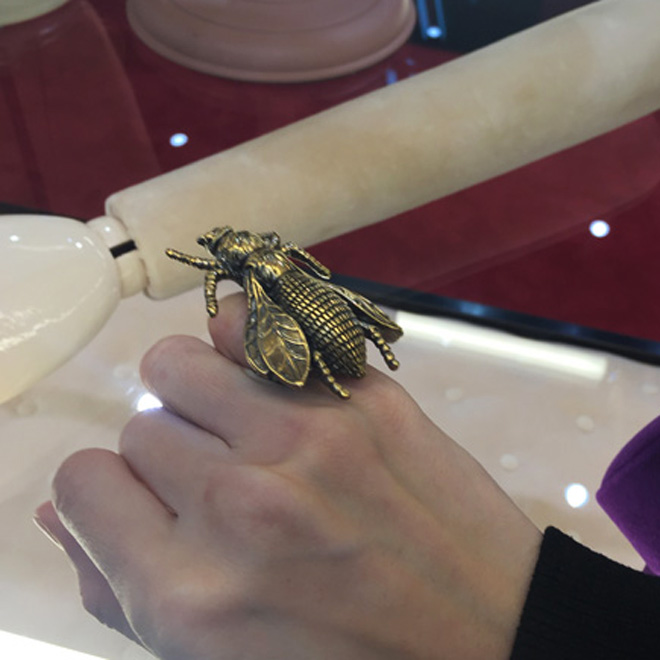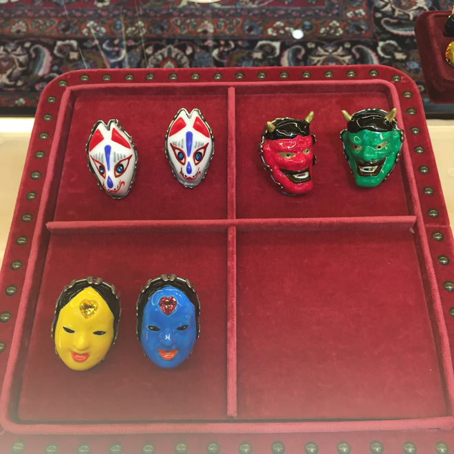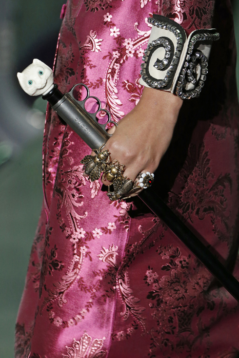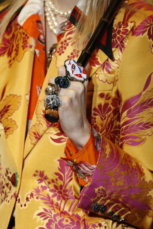 アクセサリーも見所がいっぱい。ミケーレ本人の手元を見ても、いつもほとんど全ての指にリングがはめられているが(時には1本の指に2個以上)、ショーのモデルたちも同じようにスタイリング。今季はアンティークな輝きの昆虫の指輪や、日本の能面から着想を得たと思われる鬼や白狐などユニークなリングもあり。