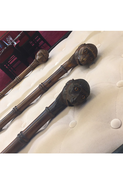 他にも、昭和天皇がかけていたようなクラシックな丸メガネや、握り部分が猿の頭のステッキなど、ショー後にアイテムが展示されたショールームを歩いていると、どこかのビンテージショップに迷い込んでしまったような気になってくる。