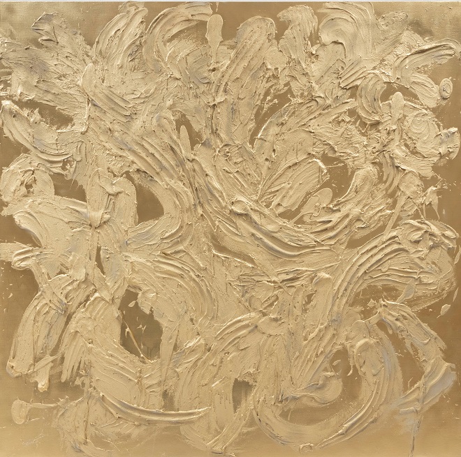 躍動感のあるストロークが大きなキャンバス全体を力強くうねる「Flower」は、普段は色彩豊かな画風の中北氏の作品としては珍しく、使用色はゴールドの一色のみ。「本物の花というよりは、心の中に咲いた“感情の花”」と彼女が言うように、ただ美しい花というよりは、猛々しさもはらむ。烈しく大胆でいて、凛とした感情の渦が見えてくるようだ。