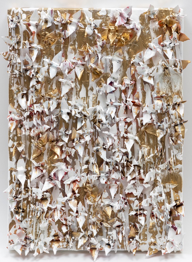 モダンなオブジェのような作品は、近づくと小さな折り鶴がアタッチされたものとわかる。