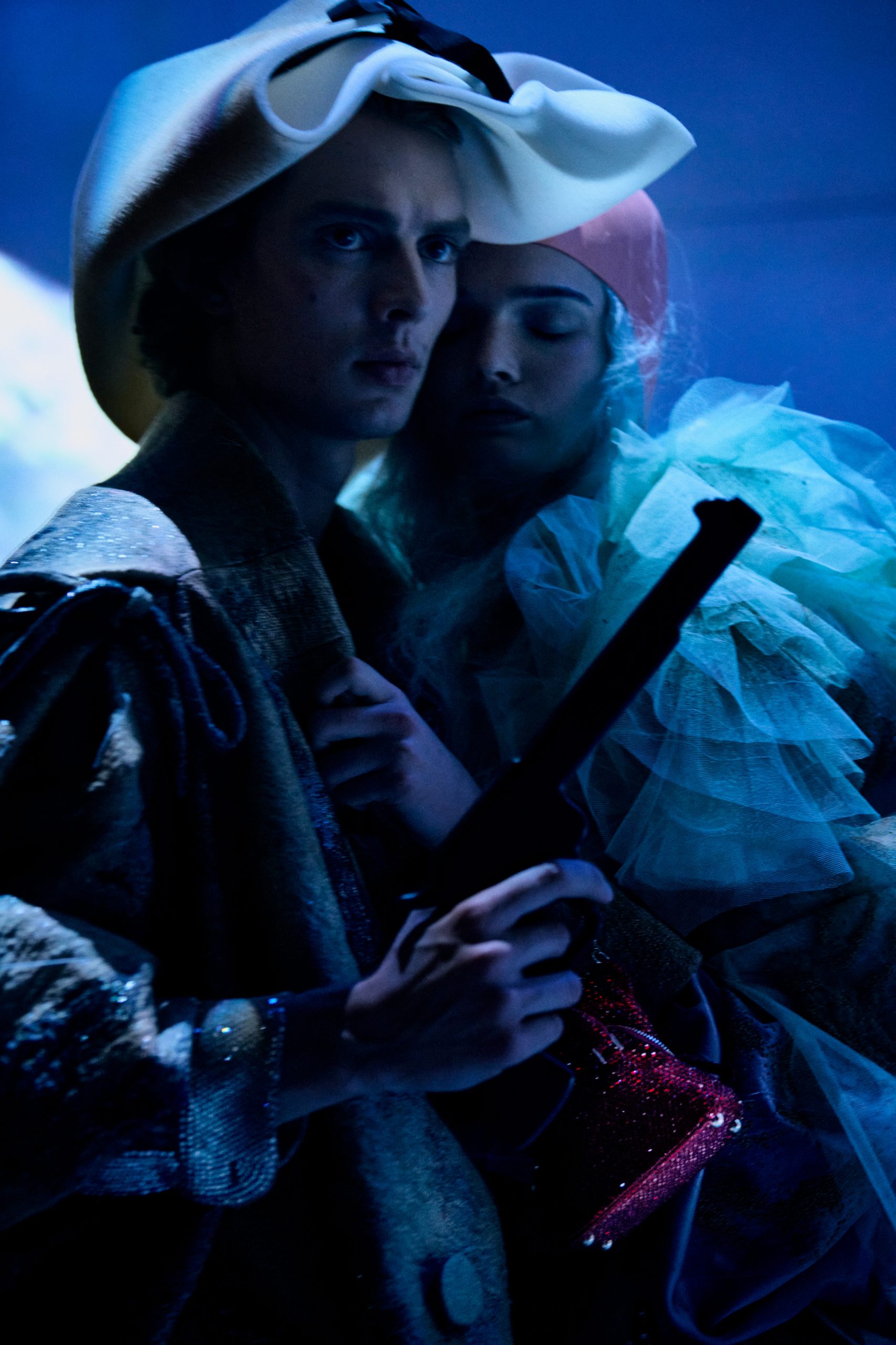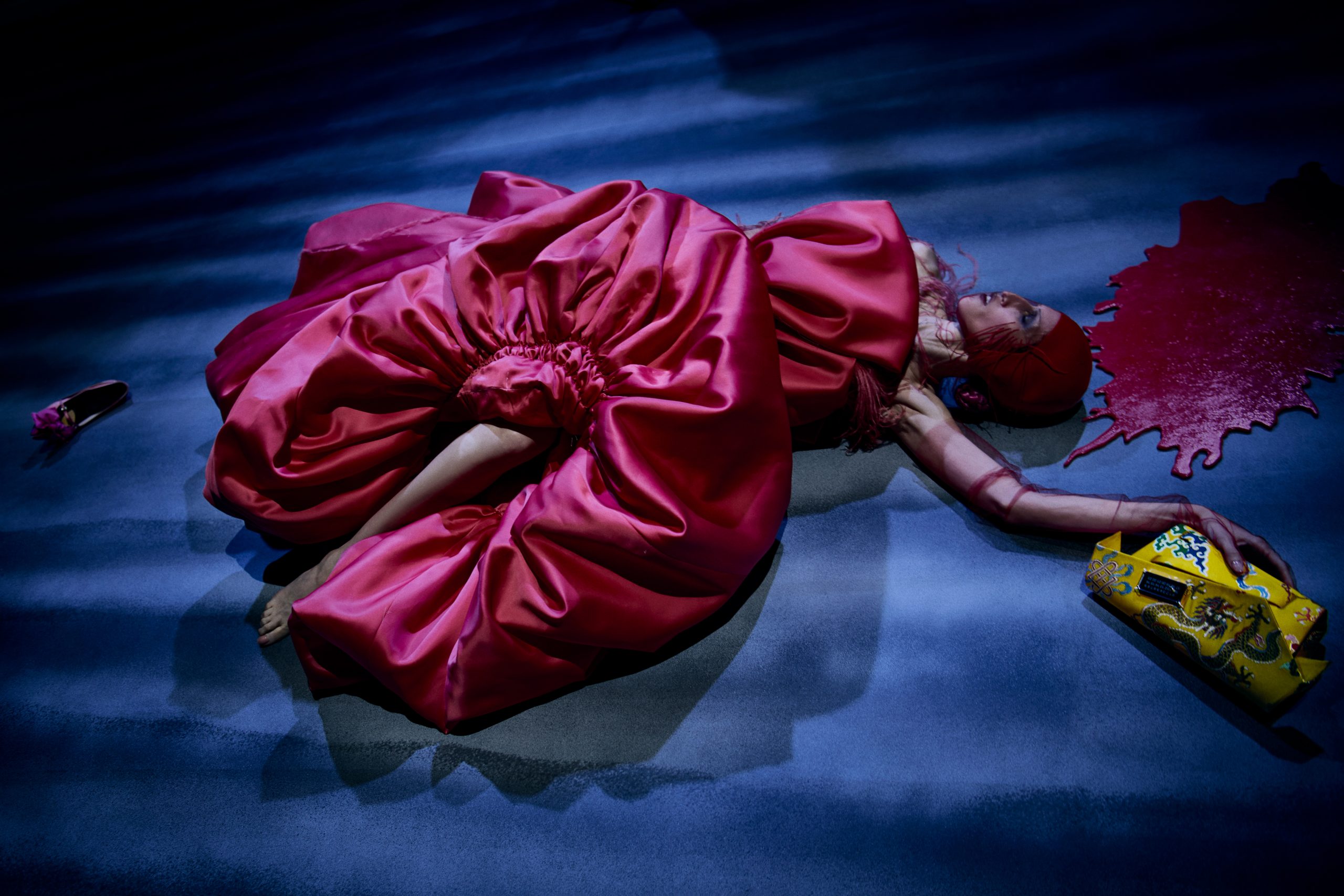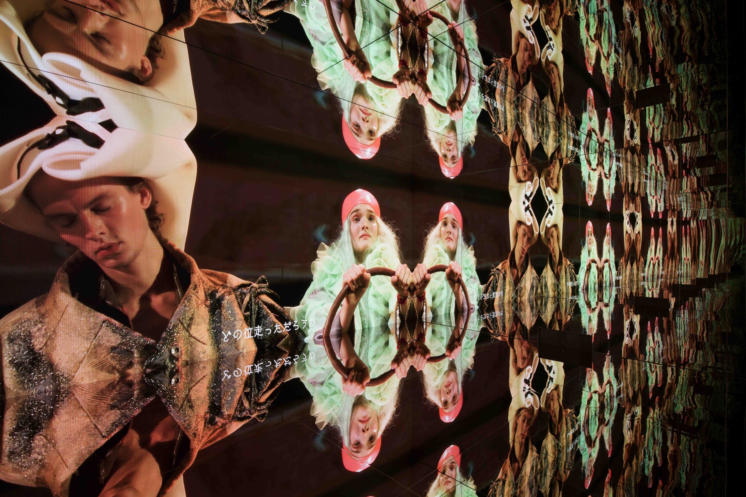 その『シネマ・インフェルノ』の世界がそのまま渋谷にやってきた、というのが今回のインスタレーションだ。2フロア構成の会場1階には、モデルたちが着用したコレクションが物語の雰囲気そのままに展示されている。地階のシアターは前方だけでなく天井も床も鏡面張りで、作品の世界にどっぷりと浸り、実際に舞台が目の前で進行しているかのような臨場感だ。