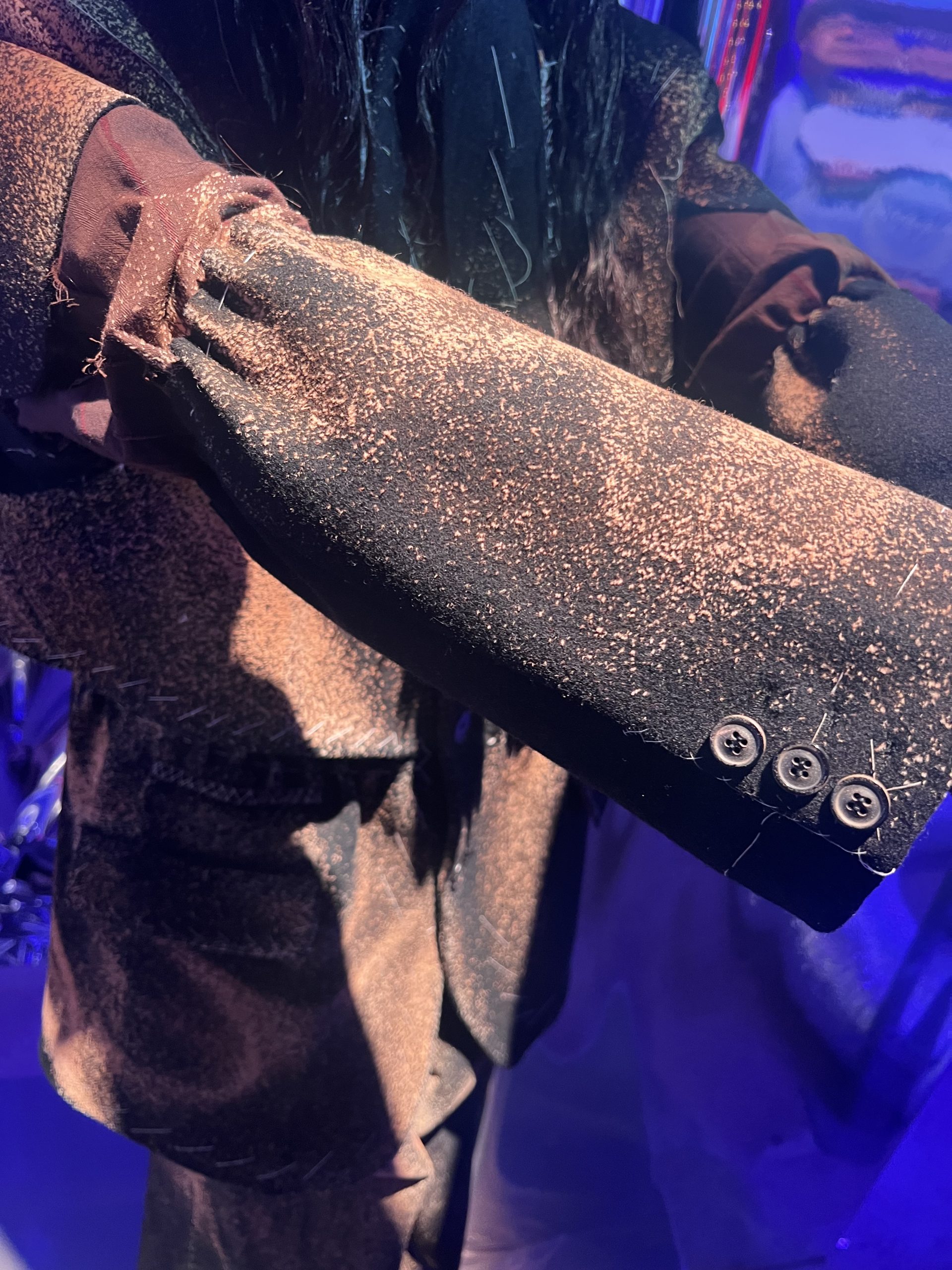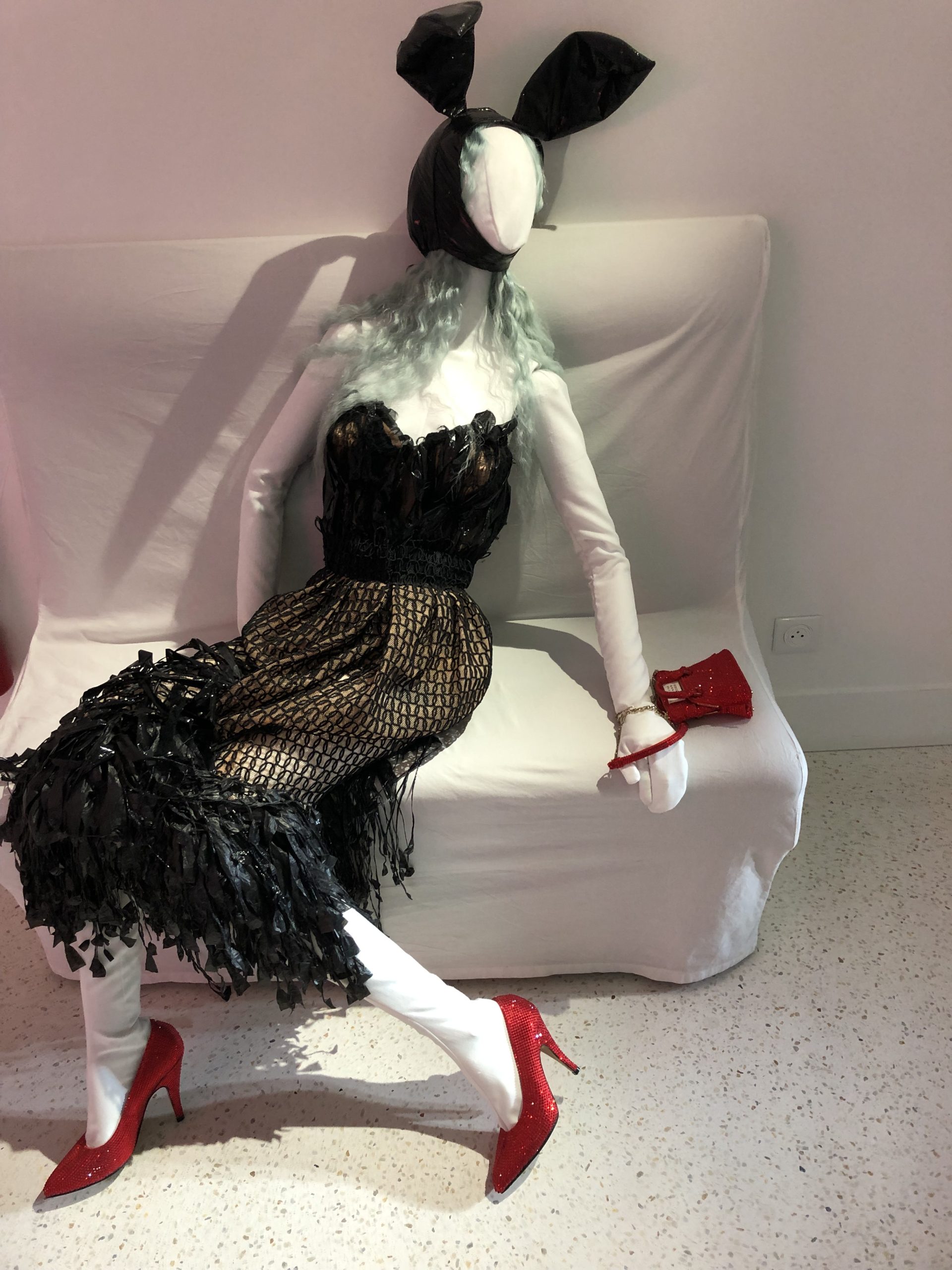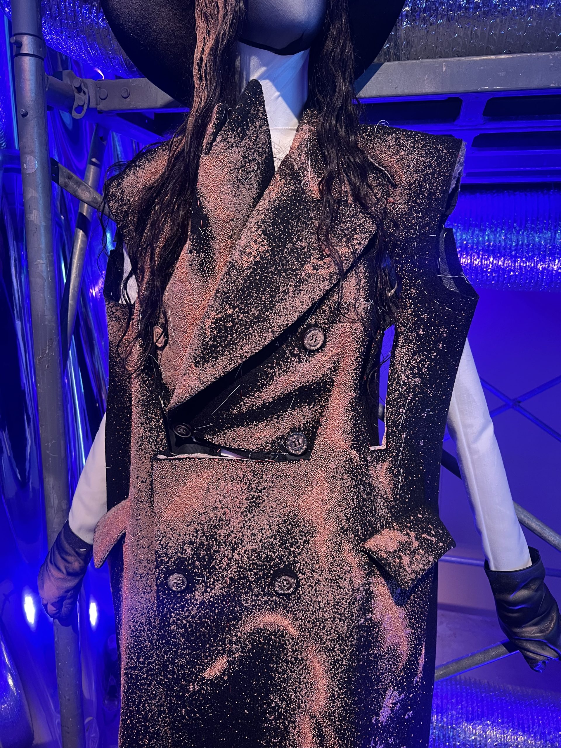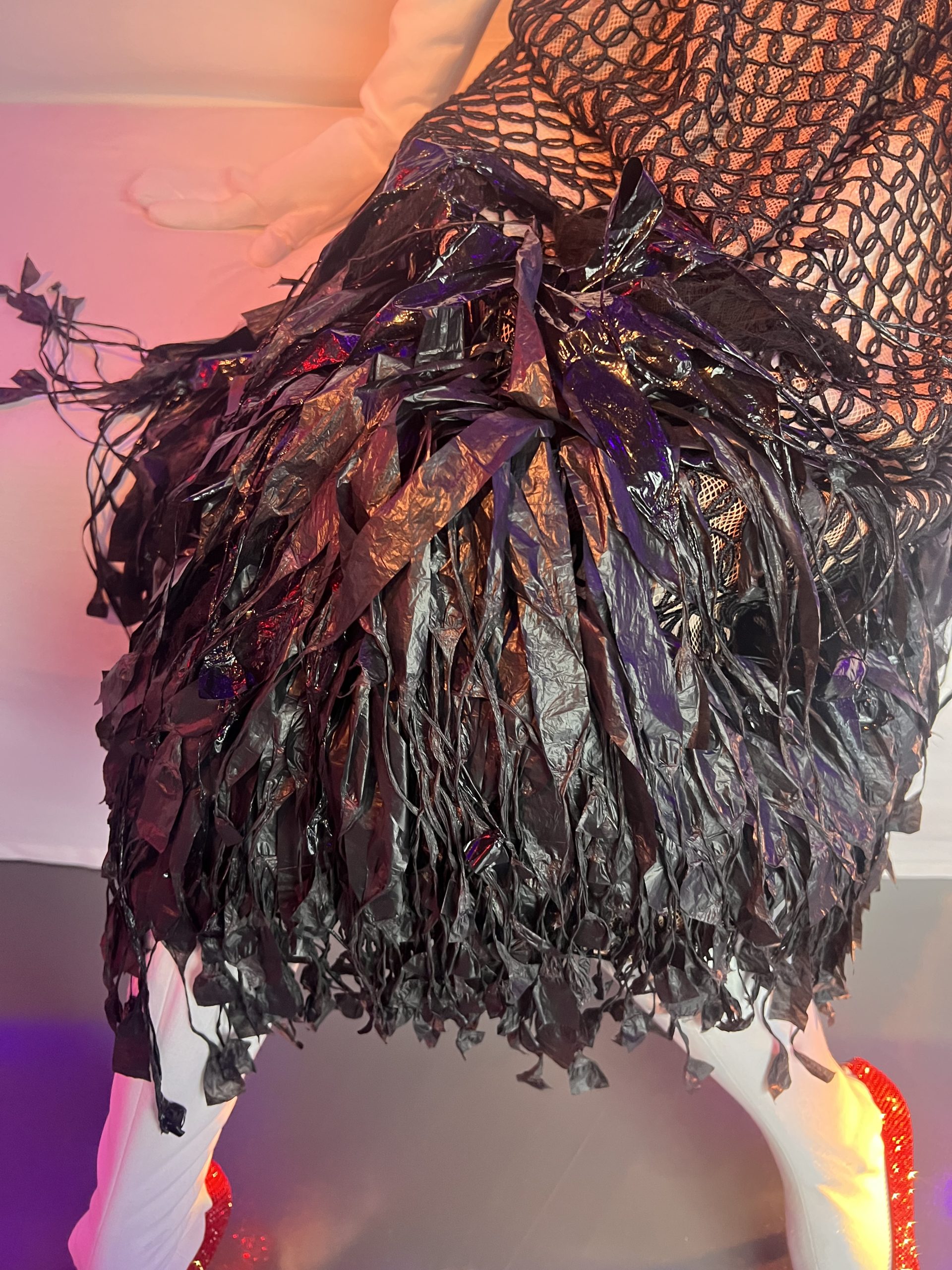 たとえば、ヘンが着ていたこの黒いドレス。裾を飾るフリンジの素材は、なんとゴミ袋だそう。フェザー(羽根飾り)のようにならないかと試行錯誤を重ね、細く伸ばしてねじり上げヒモ状に。インダストリアル、あるいはジャンクとでも言おうか、一風変わったエレガンスが目を引くドレスに仕上がった。
