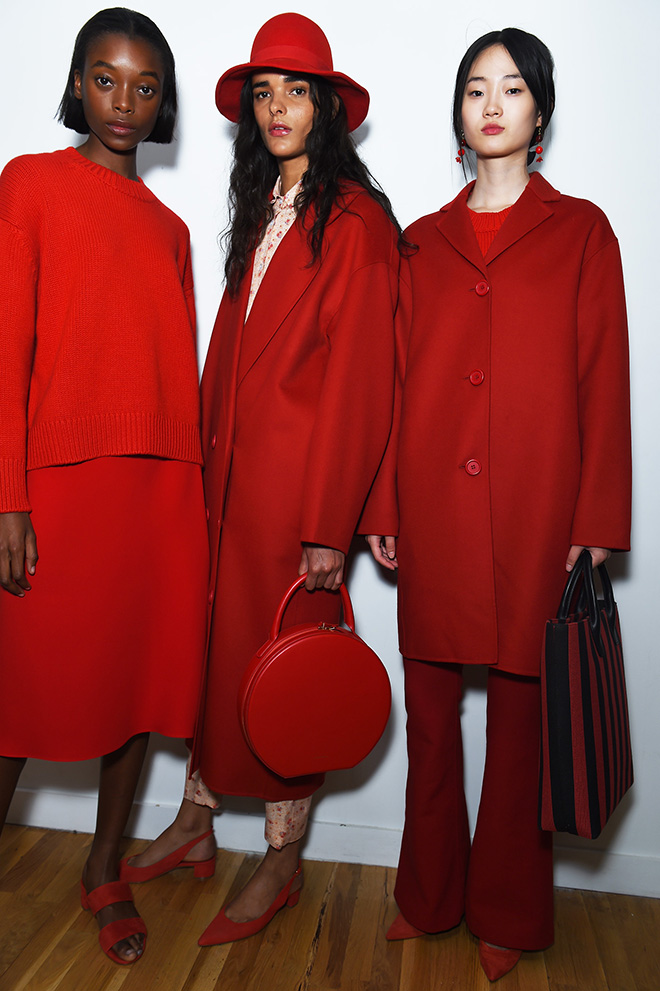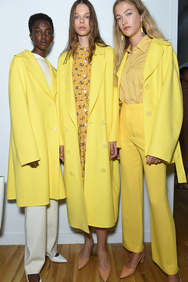 最初に目を引くのは鮮やかな色使い。ピンク、イエロー、レッドなど気持ちをリフトアップするカラフルな色を同系色でコーディネートした。イニシャルアイテムはオーバーサイズのカシミヤコート。シンプルながらも計算され尽くしたフォルムは、エフォートレスな女性らしさが魅力的。