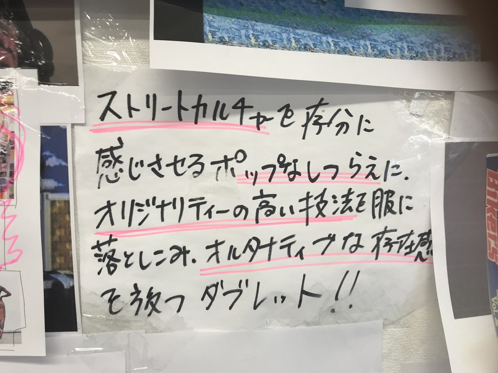 渋谷から私鉄で数駅、降り立った駅直結のマンションの一室がダブレットのアトリエだ。インタビューのために通された中央のミーティングテーブルを、スタッフの作業デスクやラックにかかった商品、床に積まれた資料が取り囲む。ふとすぐそばの井野のデスクの方へ目をやると、正面の壁にはイメージボードのようにたくさんの画像がコラージュされていた。真ん中には、まるで学生が試験勉強のために目標を書いて掲げているかのように、手書きのキャッチコピーが貼られている。