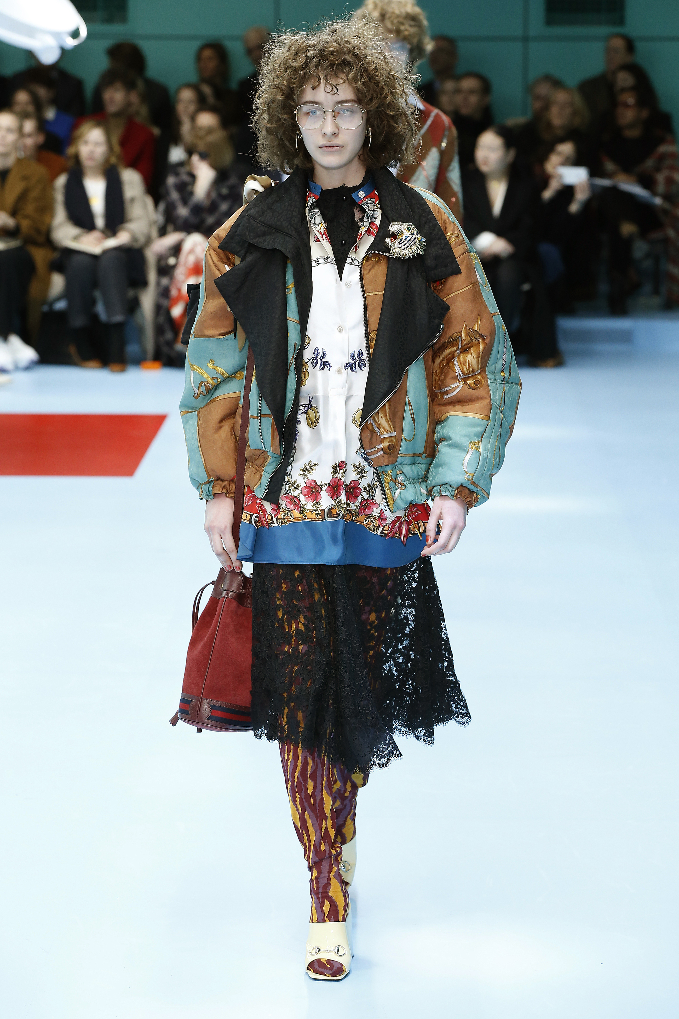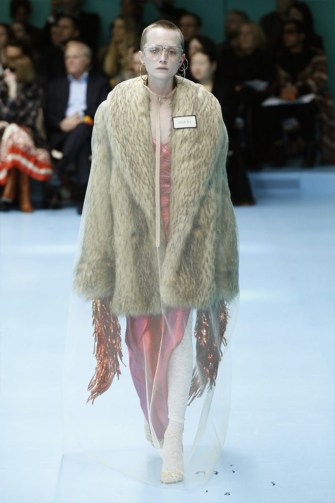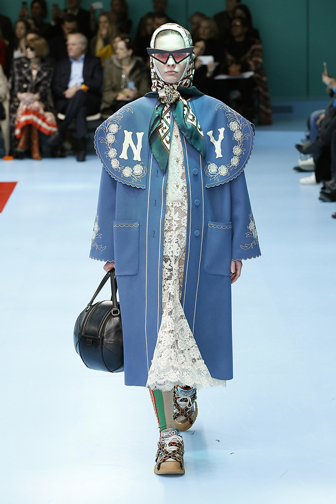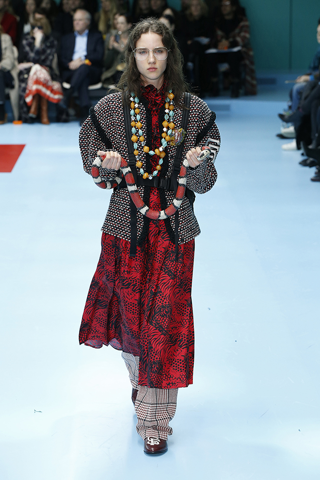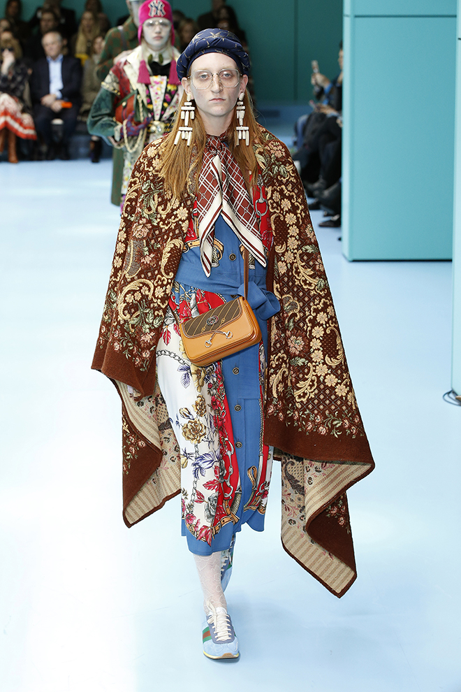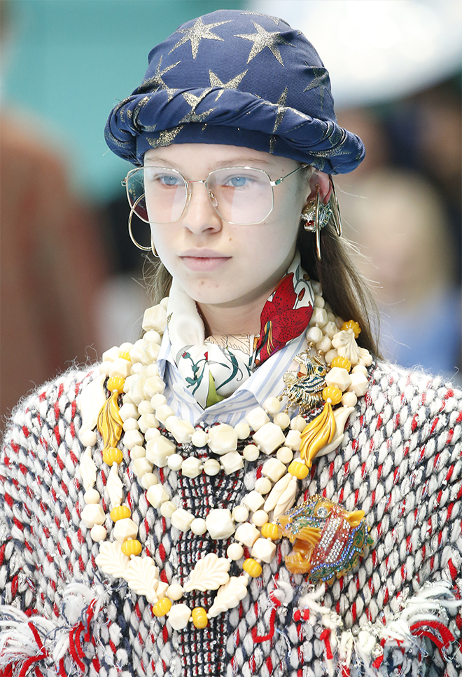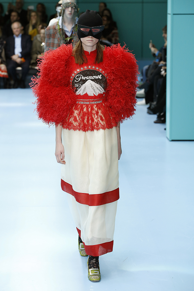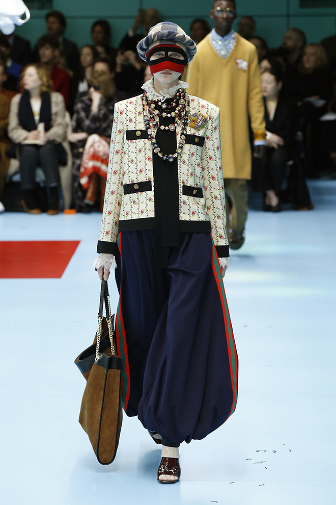 一つ一つのアイテムを見ると着やすいが、コーディネートで面白さや今っぽさを出すグッチらしさは継続。ドレスの下にパンツを履くなどは当たり前。メッシュのガーメントケース風のケープをスーツの上にすっぽりと被って、不思議なニュアンスを出すなど、新アイテムも登場している。アクセサリーでは首元から腰までのボディジュエリーや、覆面プロレラーのようなマスク、ロシアのバブーシュカ風スカーフなど、懐かしくて新しいものが集まった。