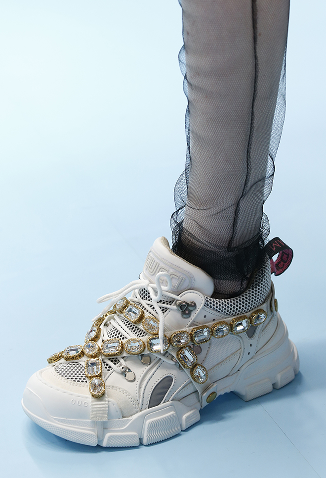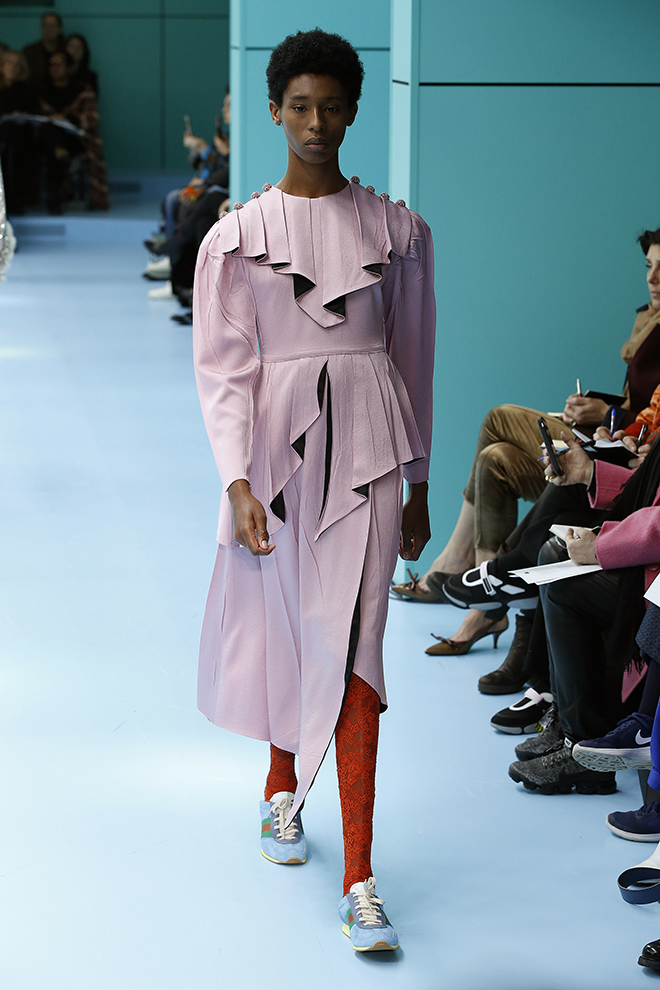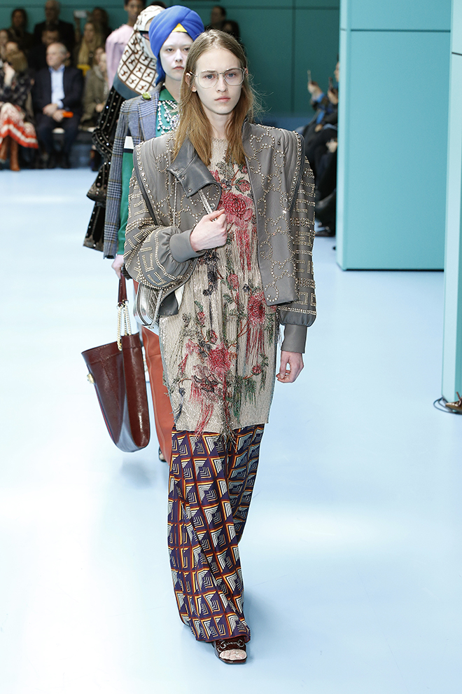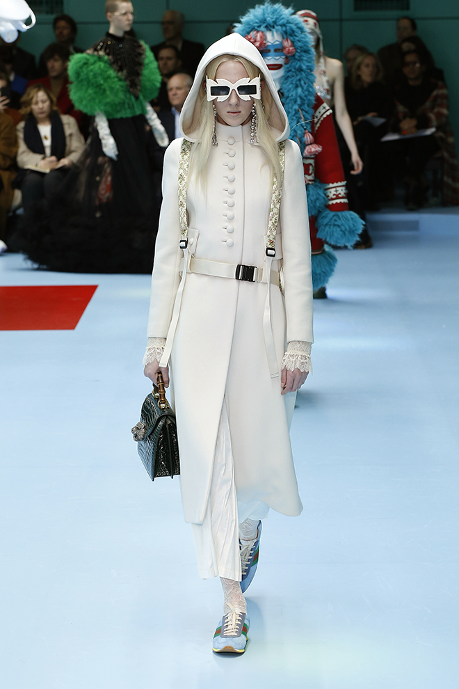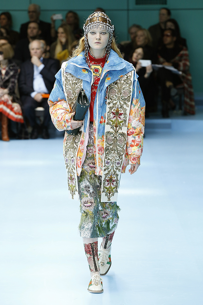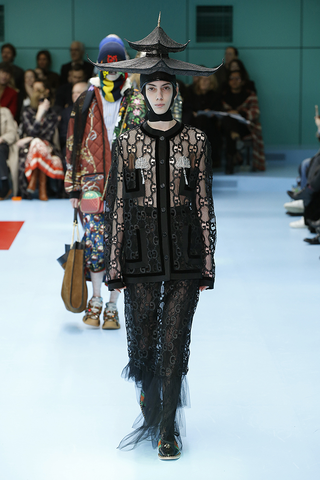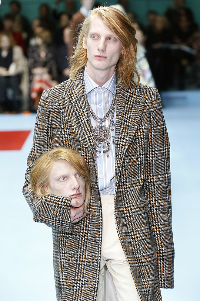 毎年2月末と9月末に行われるミラノのファッションウィーク。初日のクライマックスは、なんといってもグッチのショーだ。ウィメンズとメンズ合わせて90~100ルックのきらびやかな行進は、まるでめくるめく絵巻物のよう。コレクション披露の場である舞台設定も注目の的だ。1年前に移転したグッチ本社(飛行機の格納庫を改装)の広大な空間での大がかりな演出が毎度話題を呼んでいる。こけら落としとなった去年初めのショーでは、長いチューブ型の回廊が現れた。その翌シーズンは、がらっと様相を変え、まるで美術館の遺跡フロアのように、至るところに神殿風アーチや彫像、オブジェを設置。謎めいた演出は来場者の深読みしたくなる知的好奇心を大いに刺激する。さて、2月末に発表された2018-19年秋冬シーズンも様々な「謎」が仕掛けられたコレクションを紹介しよう。
