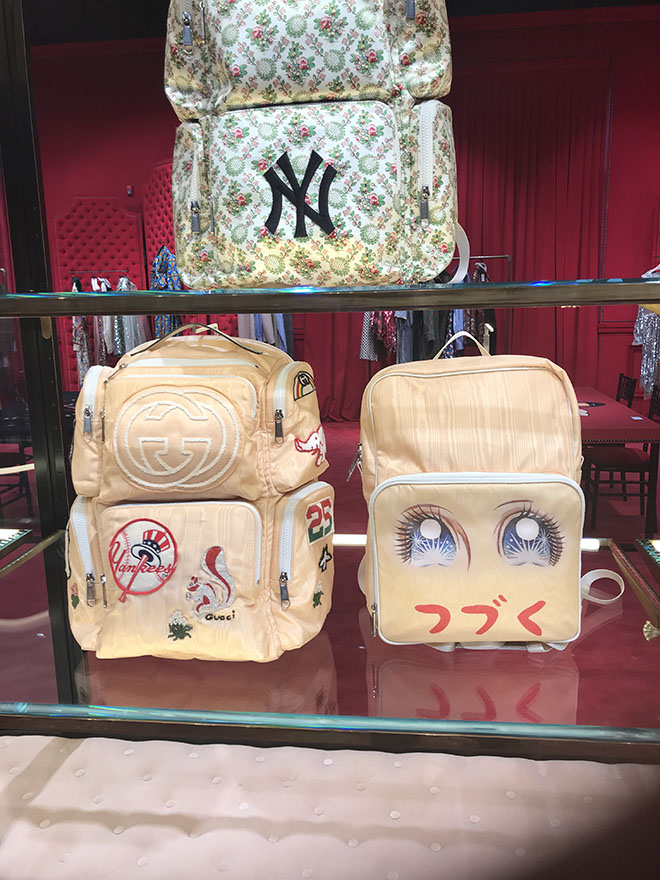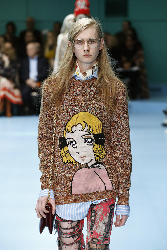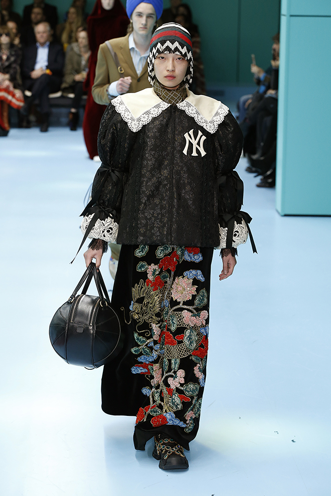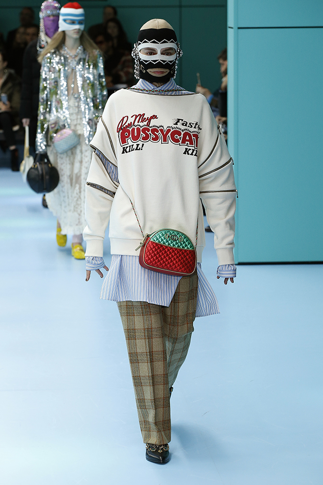 ファッションだけにとどまらずアートやカルチャーを中心に様々なジャンルへと広がるコラボレーションにも注目。今季は、米国メジャーリーグや映画会社パラマウントのロゴマーク、ラス・メイヤー監督のカルト映画『ファスター プッシーキャット!キル!キル!』のタイトル、そして日本のスポ根もの少女漫画『ビバ!バレーボール』(井出ちかえ)のイラストなど、個性の際立つものばかり。その一つ一つがグッチの万華鏡のような世界観を彩り、全体としての魅力と迫力を増していた。