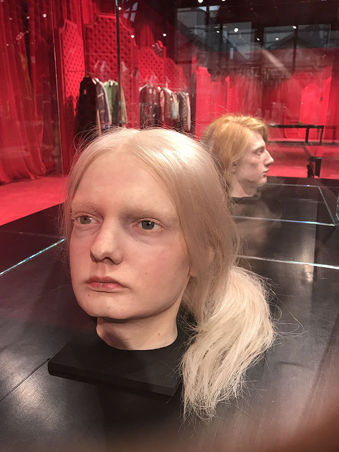 会場をあっと言わせたのは、クールに歩くモデルが手にした、彼女そっくりの生首。まるでクラッチバッグのように小脇に抱えて平然と歩く姿は今季最高のシャッターモーメントだった。ただこの頭部のレプリカ、単にセンセーションを狙ったわけではなく、ミケーレの深い思いがあるようだ。
