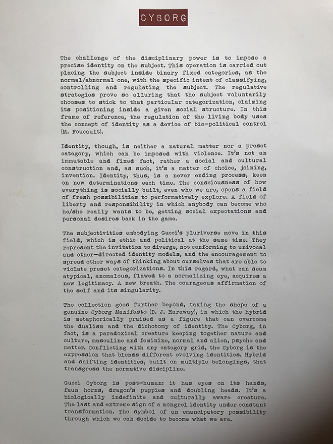 会場入り口で渡されたリリースには、「CYBORG」のタイトル。クリエイティブディレクターのアレッサンドロ・ミケーレが今回インスピレーションを受けたのは、思想家ダナ・ハラウェイの『サイボーグ宣言』(1984)なのだそう。ハイブリッドに絶えず変化するアイデンティティの新しいあり方を“サイボーグ”と呼んでいる。