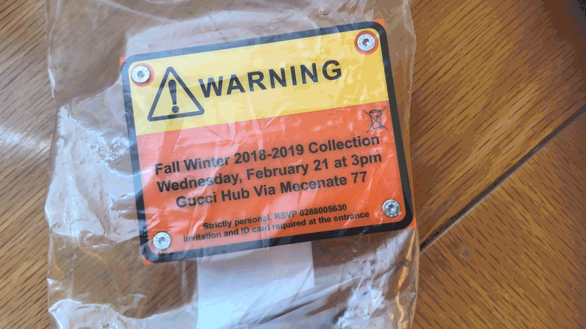 今季の招待状はビニールパッケージの中に「WARNING!(警告)」と大きく書かれたオレンジ色の箱。裏返すとデジタル表示の数字が刻々と減っていく。ショーまでのカウントダウン?爆発物を連想させる怪しいパッケージに否応なしにショーへの期待感が高まる。