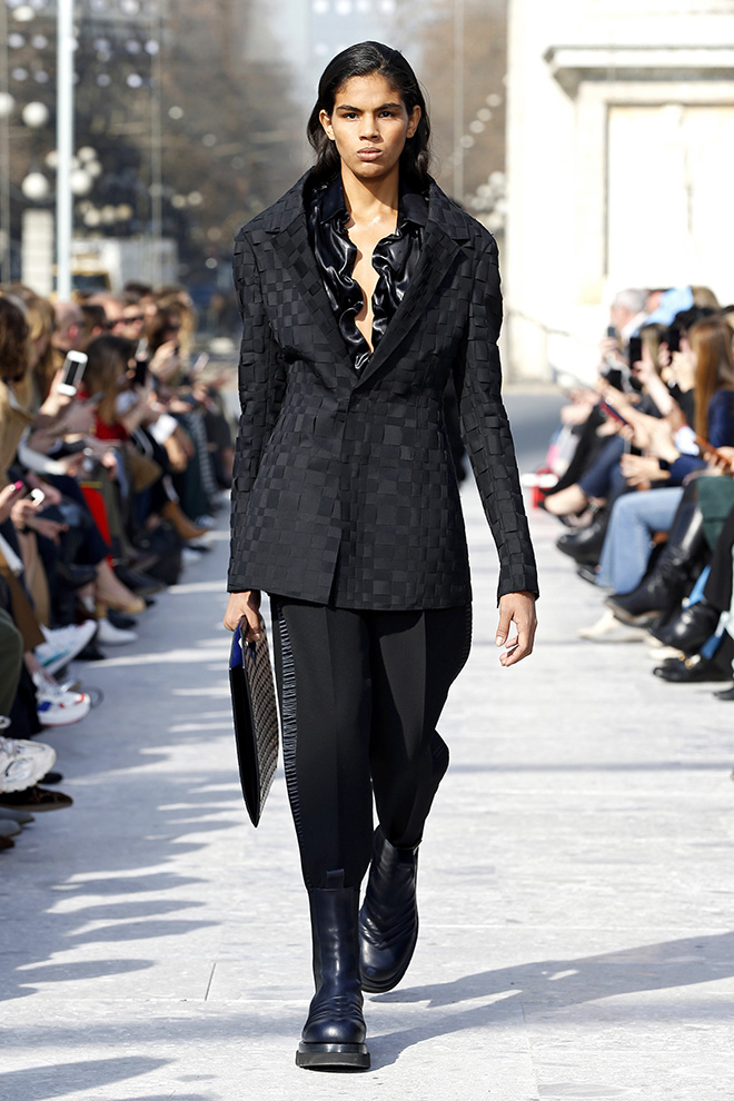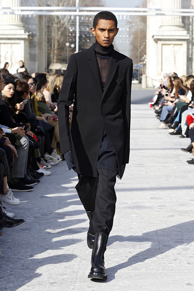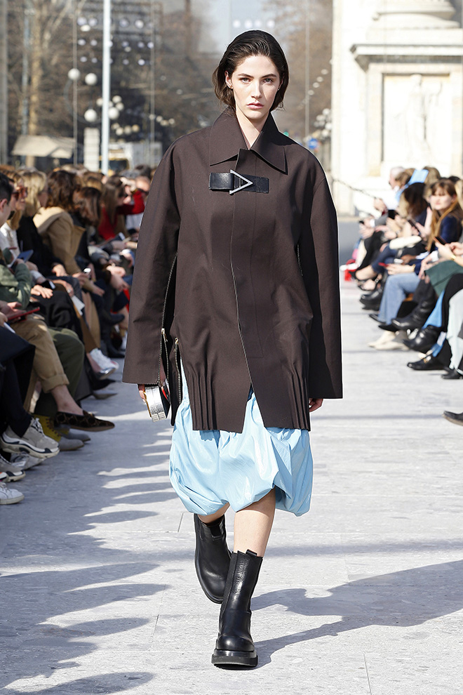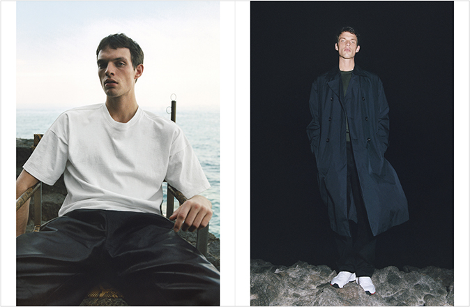 今回の初ランウェイで特徴的なのは、メンズとレディスが互いに呼応するようなファッションスタイルだ。共通のシルエットを持っていたり、同じトップスやバッグを男女で共有していたり。コーディネートのキーとなったサイドゴアブーツは、当初はメンズだけに用意されたもの。本番間近のタイミングで、レディスにも同じブーツを合わせた方が今っぽいと判断したという。