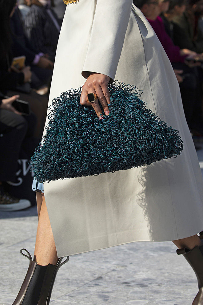 以前のボッテガ・ヴェネタで特徴的だったニュアンスカラーを中心とした色使いも刷新。ニュートラルカラーに、敢えてケミカルでポップなカラーを組み合わせてモダンさを演出した。