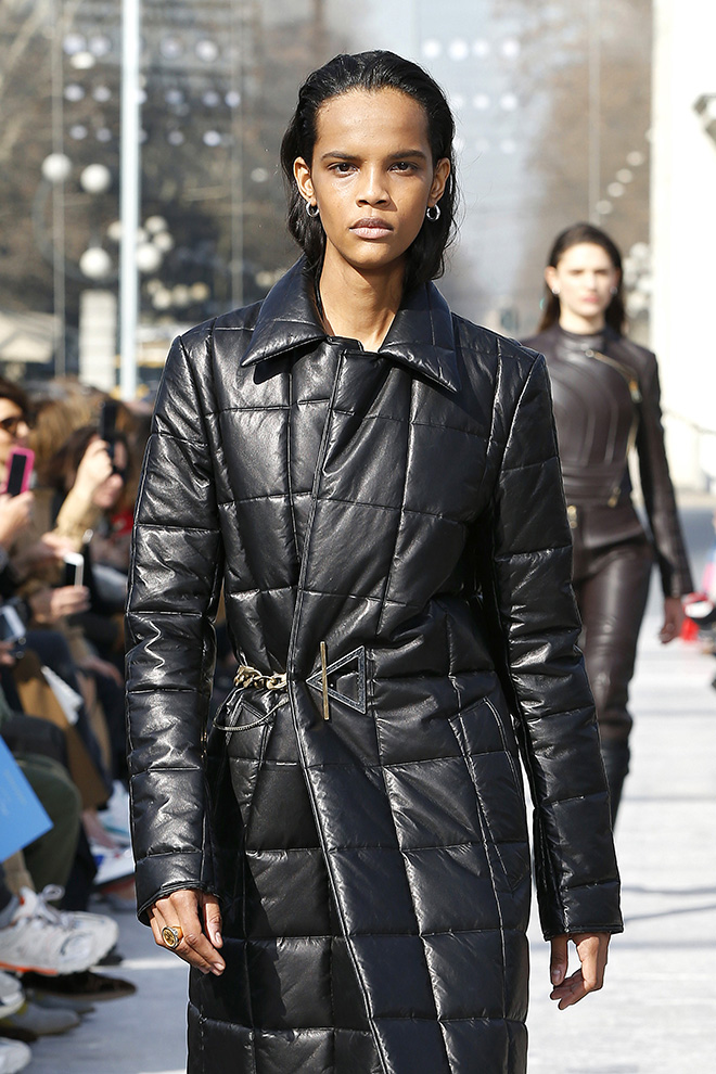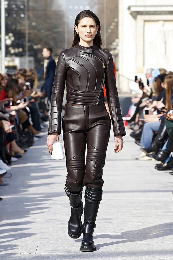 リーの好きな車やバイクなど、メンズカルチャーも新生ボッテガ・ヴェネタにインスピレーションをもたらしている。たとえばバッグに使われたキルティング。光沢のあるパフっとした素材だが、これは高級車の内装から着想を得たもの。バイカースタイルを彷彿とさせる上下レザーのセットアップも骨太な女性像をスタイリッシュに表現している。