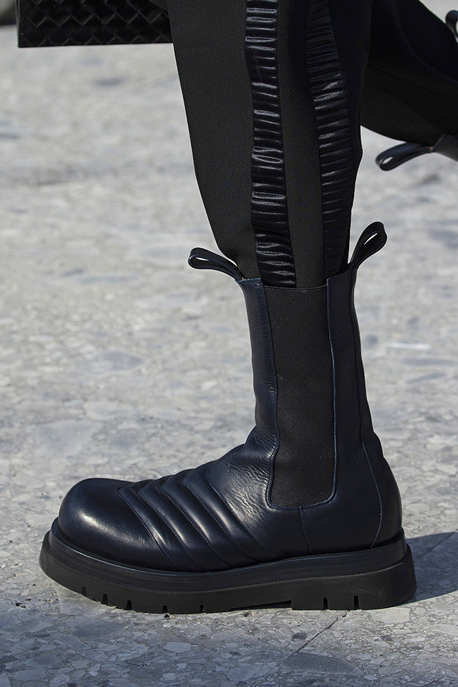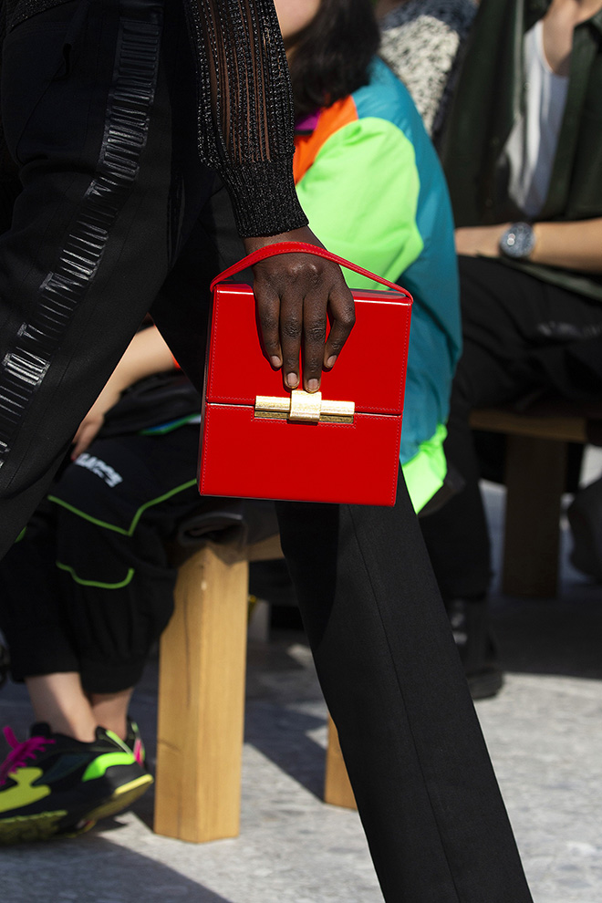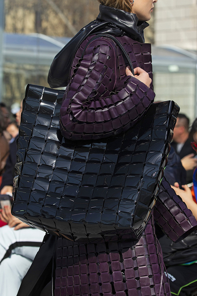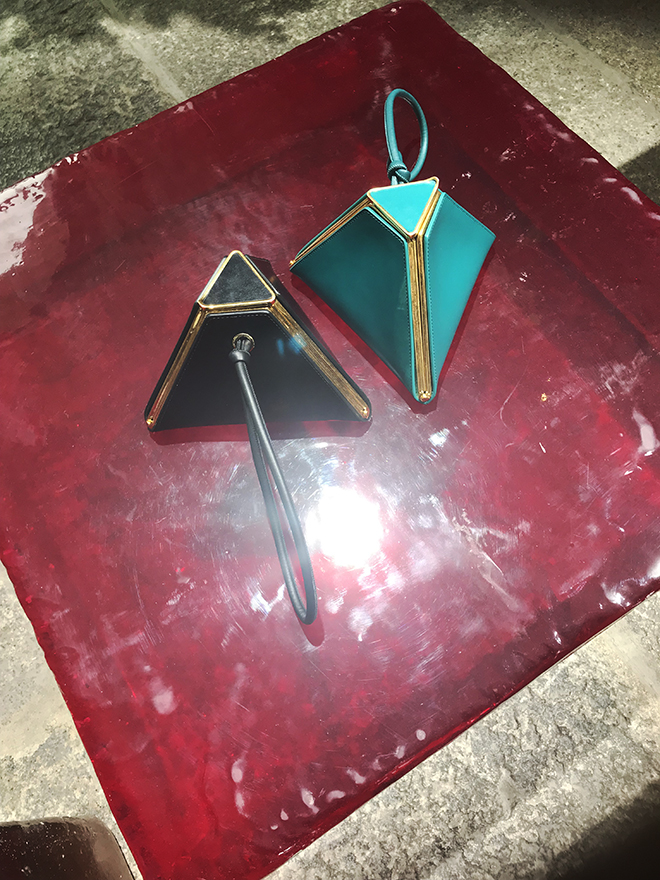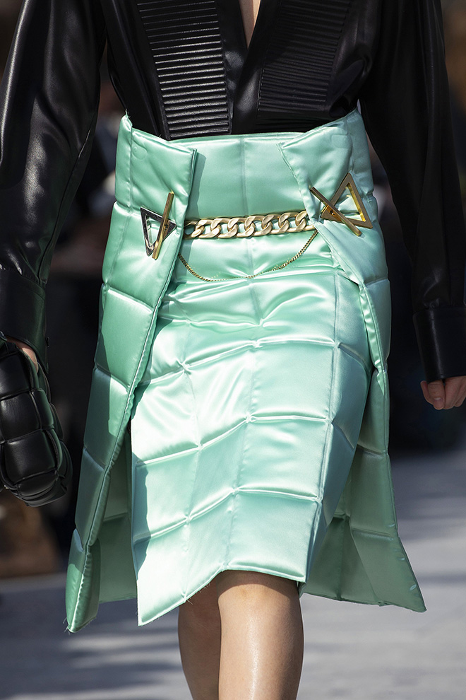 さて、ボッテガ・ヴェネタといえばイントレチャート。レザーを編み込んだ、ブランドが誇るクラフツマンシップを象徴するディテールだ。ロゴはなくともイントレチャートがボッテガ・ヴェネタ=高級ブランドと仄めかすということで、「ステルスウェルス(stealth wealth:知る人ぞ知る密かな贅沢)」の代名詞となった。そのイントレチャートに新鮮さを出すために、リーはグラフィカルなアレンジを施す。従来のように斜めに使うのではなく、垂直に編んでみたり、編み込むレザーを極端に太くして、まるで虫眼鏡を覗いているかのように大胆に拡大してみたり、ビジュアル的でポップな手法を利かせている。さらにグラフィカルなアクセントとして、三角のバックルモチーフもアイコン的に多く登場させた。
