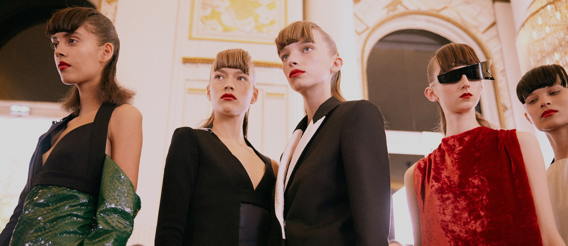 ジャケットを再構築した大胆なデザインに、メリハリの利いた色使い、ポップなプリントのファッションに合わせたシューズは、靴……下?