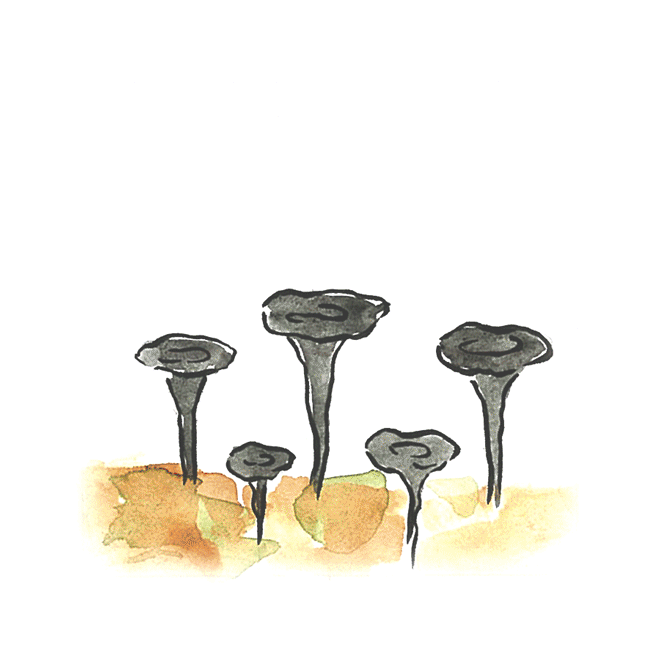 そのなかでも、言わずもがなセップ茸は、その他のキノコたちの中で目を引く変わったフォルムのキノコの王様。その名も「Trompette de la mort」(死者のトランペット)という本当にトランペットみたいな形をした黒いかっこ良いキノコ。