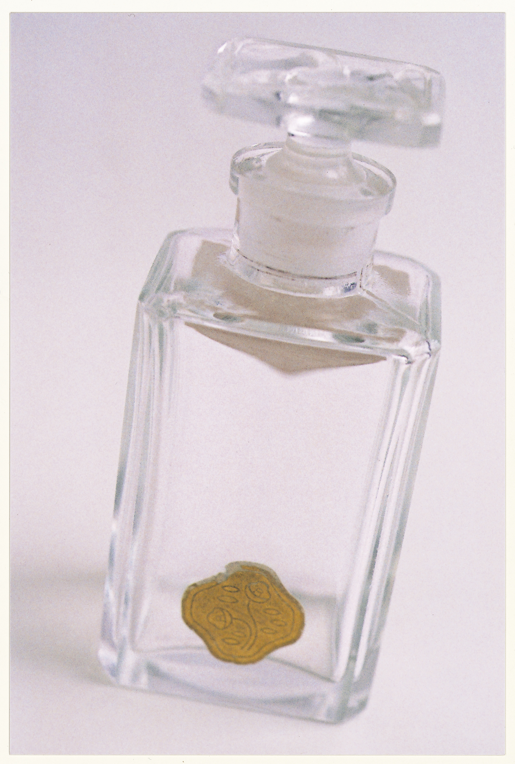 この写真を見ていると、香水瓶なのに、どこか、ひとりの人の姿のように見えてきます。いったい誰でしょうかね。私なら、この香水瓶を世に送り出した人、福原信三と答えたくなります。信三がこの香水瓶、つまり「香水 花椿」を売りに出したのは1917年。今から100年以上もむかし。資生堂初の本格的香水でした。信三は、持てる力のすべてを投入したのではないでしょうか。時を超えて、写真の彼方から、そのときの気持ちが伝わってきます。