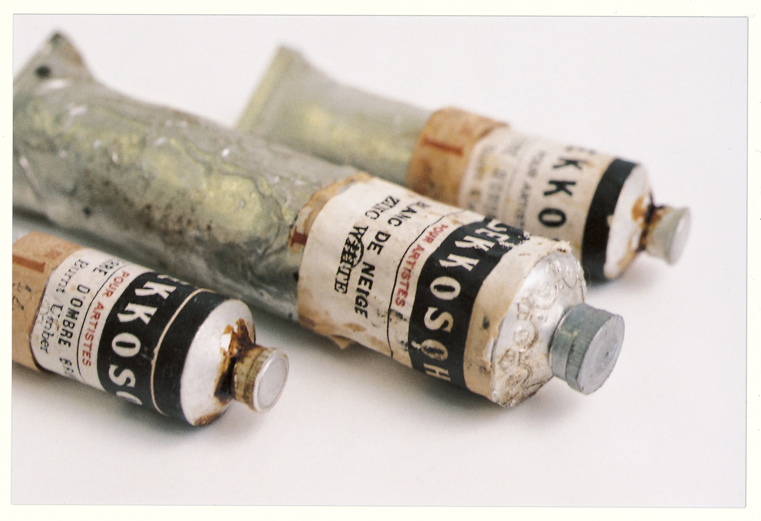 この絵具は戦時中に月光荘で製造、販売されていました。名前は「BLANC DE NEIGE」。フランス語で「白い雪」という意味。雪は、フランス語でいうところの女性名詞なので、どこか女性の姿のようです。まあ、私の完全な思い込みですが、若い頃、この絵具はどんな女性だったのでしょうか。「ART」という文字が見て取れることもあり、もしかしたら芸術を志していたかもしれません。希望は叶えられたのか、夢のままだったのか。いずれにしても、きっと、それとともにあった人。「銀座でよく展覧会を観てね…」などという言葉が聞こえてきそうです。
