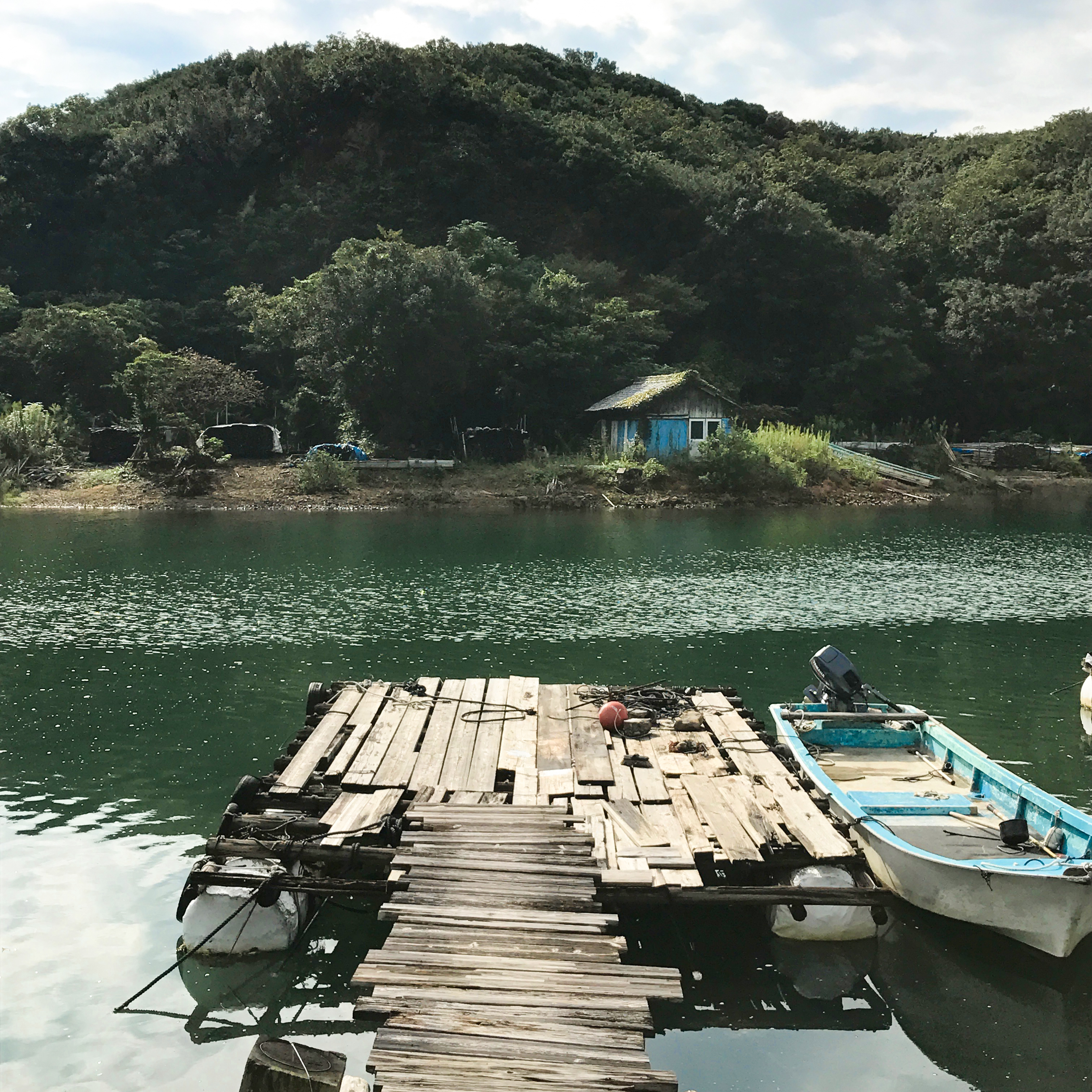 と笑って、小回りの利く白い軽トラで、細い道をとっとこ軽快に走ってゆく。運転の大森さんが懸命に後を追いかけ、5分もゆくと細長い入り江のような湾に出た。この辺りは三陸と同じリアス式海岸で、いくつもの入り江に抱かれており、ほっとするような美しい水の風景に満ちている。小浦という地名がふさわしい奥まった細長い小さな湾だった。海辺に小屋が立ち並び、そこで2、3人ずつの人がカキの山を前に座り込んで付着物を除く作業をしている。カンカンと金道具とカキの殻がぶつかる音が断続的に響く。周囲の水面には種付けされたアオサの養殖筏が浮かんでいる。