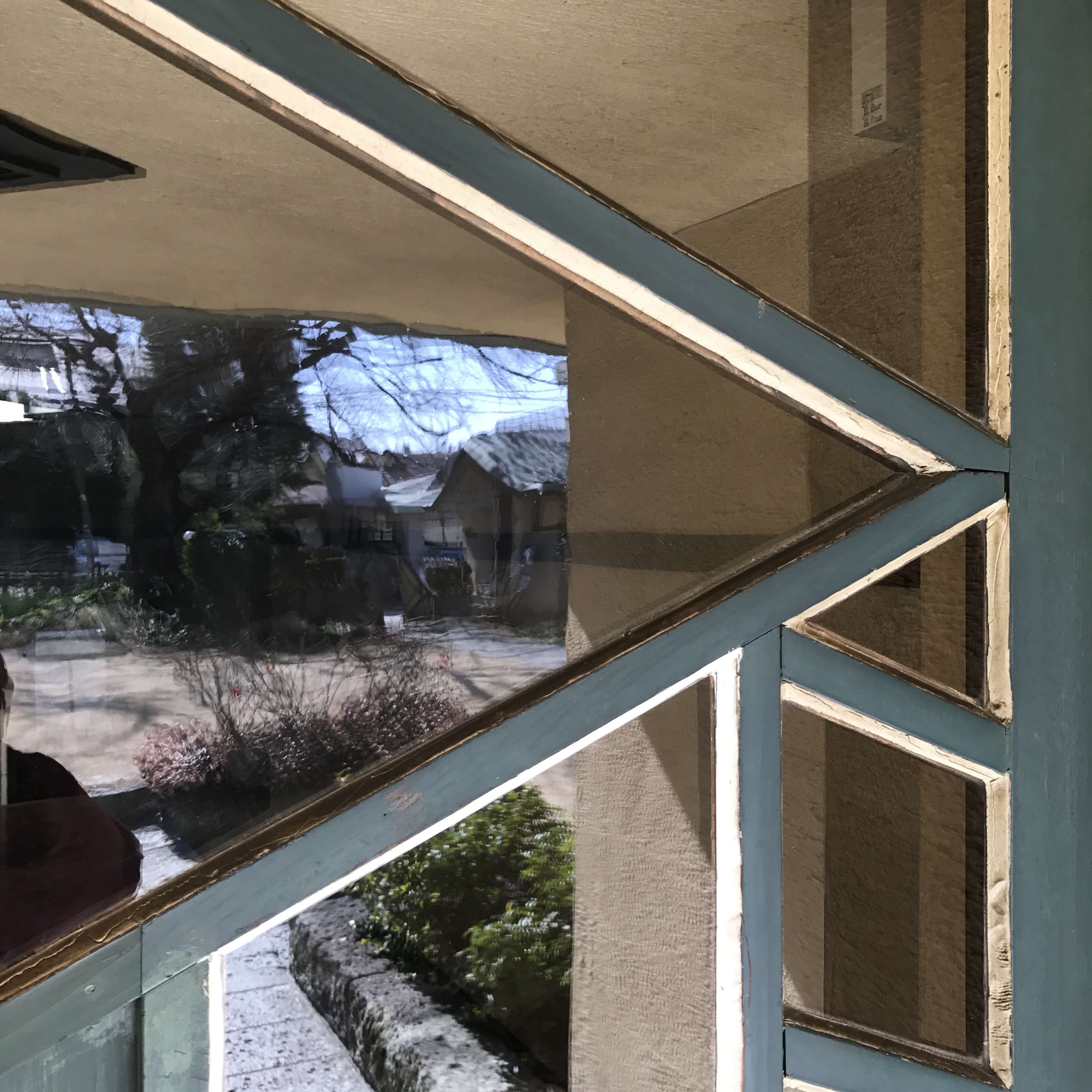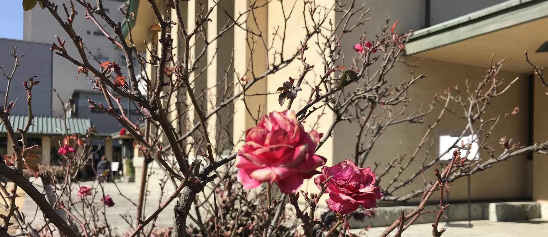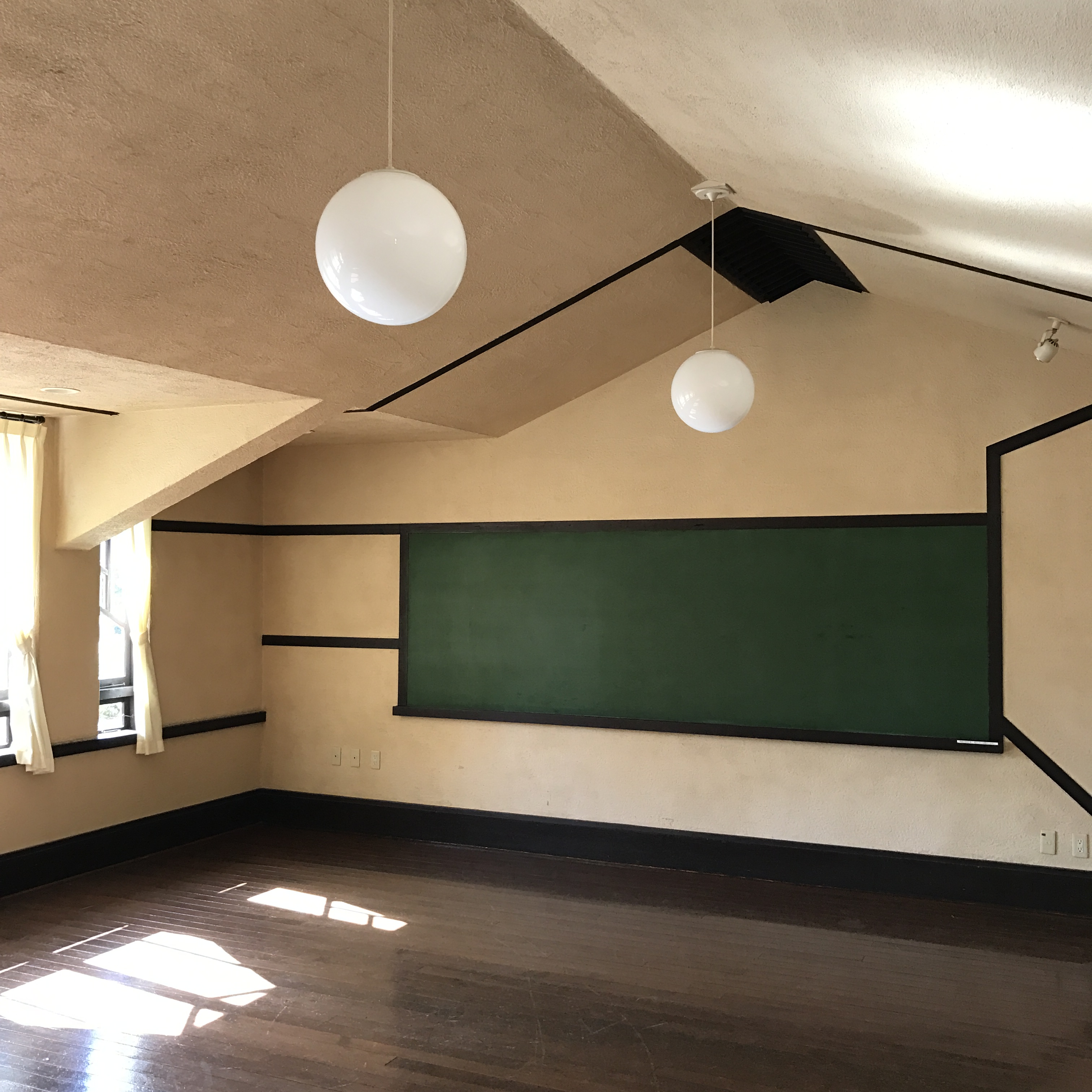 中央にホールと食堂があり天井が高くなっている他は、左右の回廊部分に教室が置かれ、薄緑の屋根が平屋のように低く連なっている。その低さに何とも心が安らぐ。色彩も屋根の薄緑が柱や壁のクリーム色と、庭の芝生の緑と相まって美しい。教室は展示室になっていたり、今も様々な団体が講義や活動に使用できるようになっており、ホールでは喫茶休憩ができる。光がぜいたくに差し込むホールは食堂と共に結婚式場としての利用も多いという。食堂に入ると、新が作った六角形の背もたれの木の椅子、使い込まれた木のテーブルに群青色のカーテンが添えられた窓から穏やかな陽が差し込んでいる。修道院のような、祈りの似合う、それでいて親しみの持てる場所だった。ふと見ると、木の壁掛けにキリスト者の言葉か、英語が刻まれていた。
