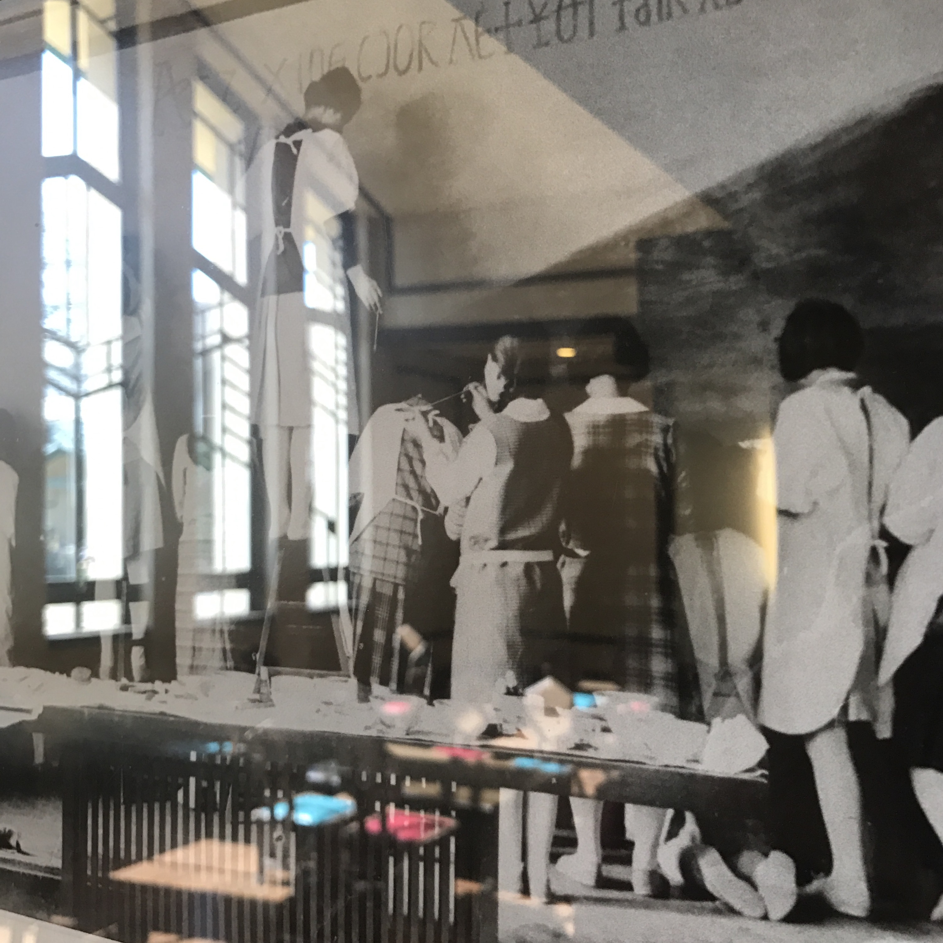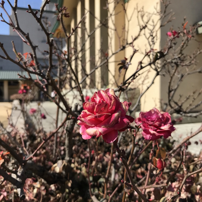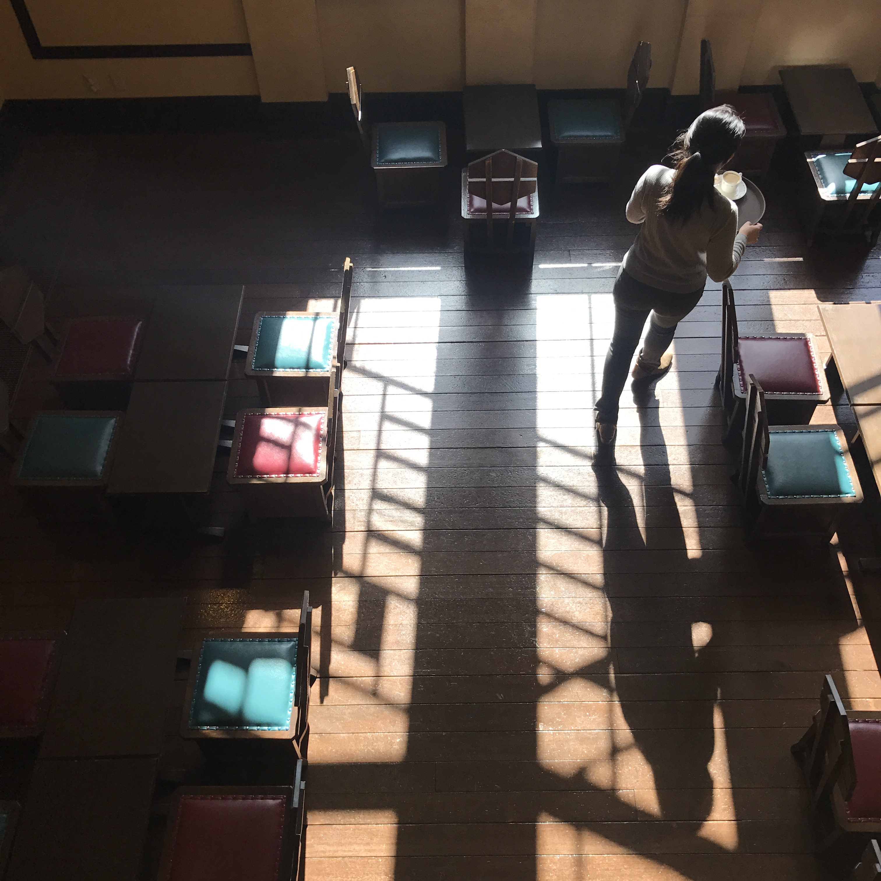中央にホールと食堂があり天井が高くなっている他は、左右の回廊部分に教室が置かれ、薄緑の屋根が平屋のように低く連なっている。その低さに何とも心が安らぐ。色彩も屋根の薄緑が柱や壁のクリーム色と、庭の芝生の緑と相まって美しい。教室は展示室になっていたり、今も様々な団体が講義や活動に使用できるようになっており、ホールでは喫茶休憩ができる。光がぜいたくに差し込むホールは食堂と共に結婚式場としての利用も多いという。食堂に入ると、新が作った六角形の背もたれの木の椅子、使い込まれた木のテーブルに群青色のカーテンが添えられた窓から穏やかな陽が差し込んでいる。修道院のような、祈りの似合う、それでいて親しみの持てる場所だった。ふと見ると、木の壁掛けにキリスト者の言葉か、英語が刻まれていた。