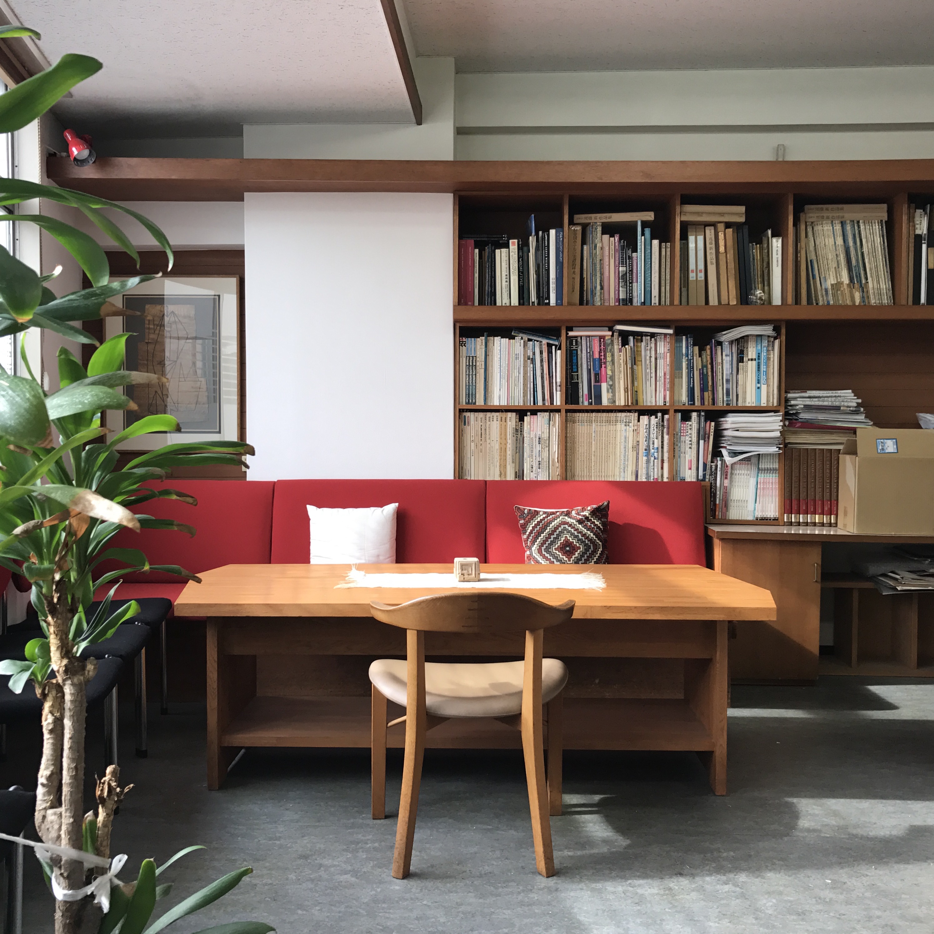 以前は伯父にあたる楽さんの事務所だったという現さんの目白の建築事務所のソファに座ると後ろの壁面上部が長い本棚になっていた。カメラの大森克己さんが、
