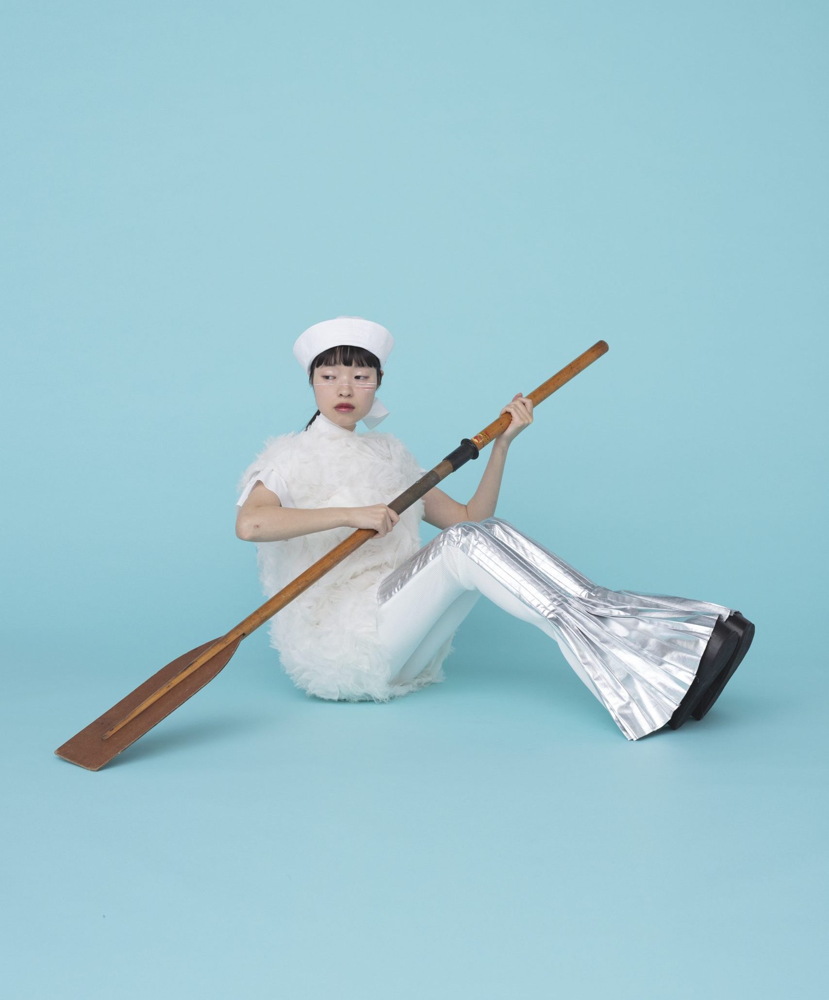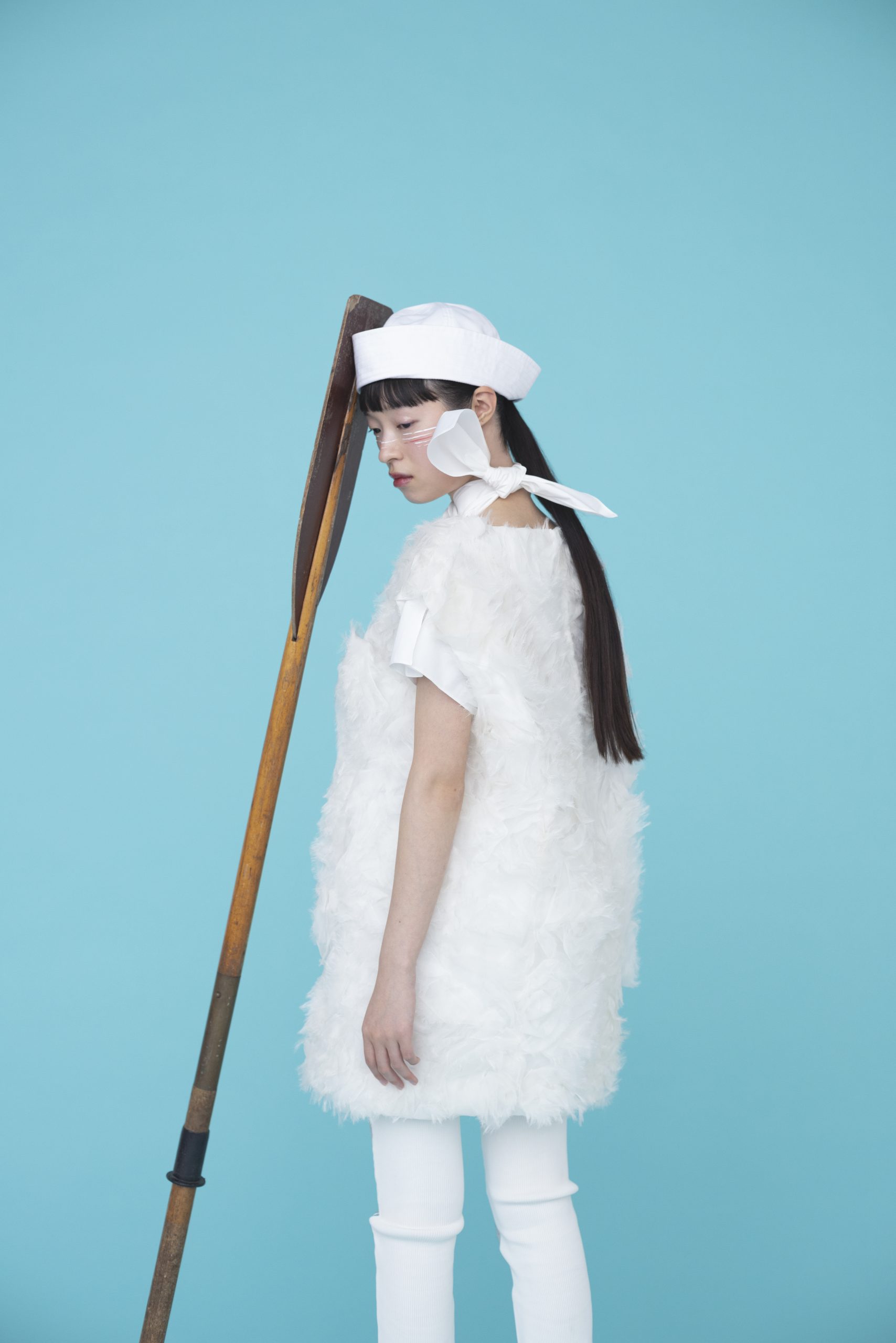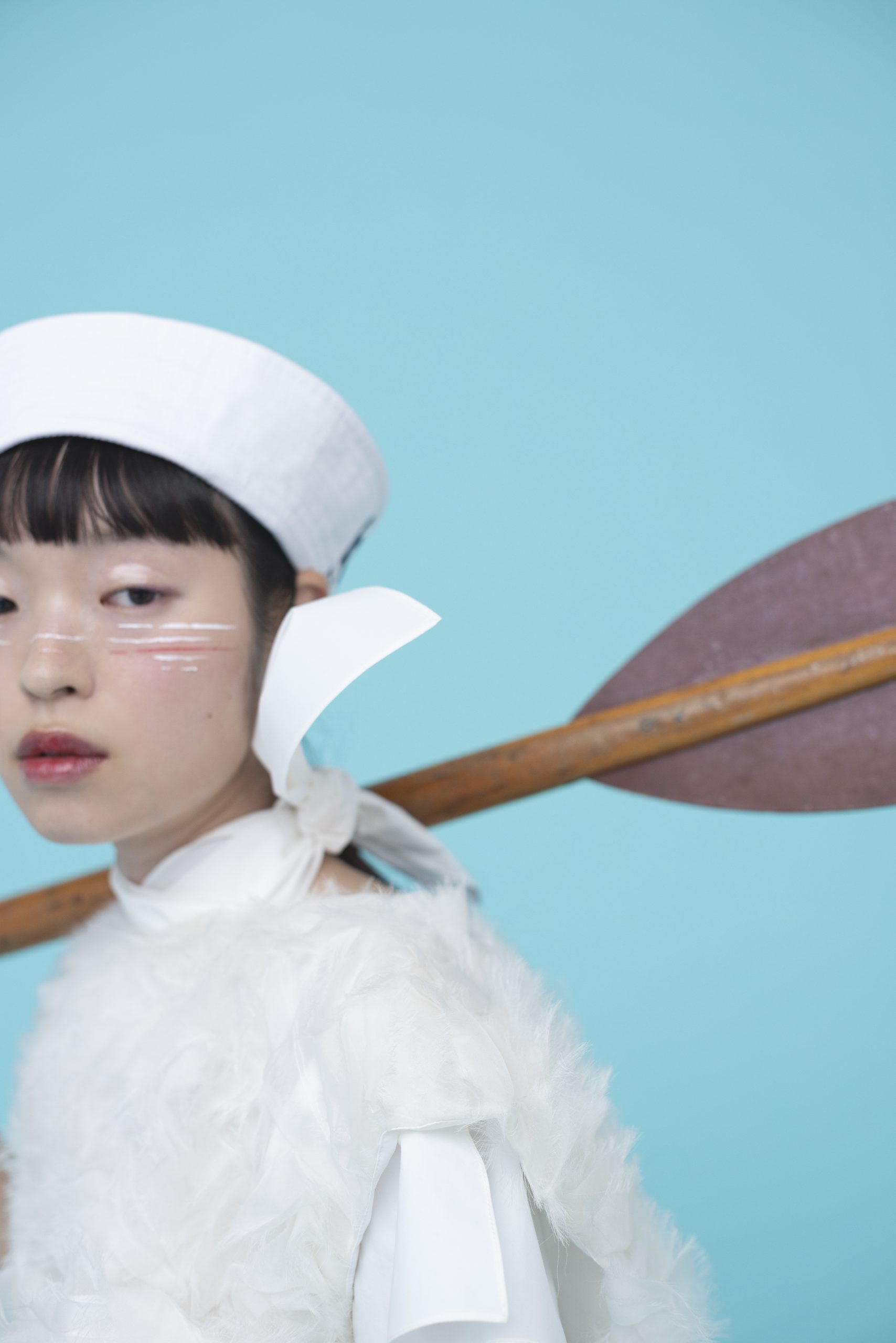 チークポイントに、スカールの少し波打つイメージで揺れや隙間を描き、赤と色のボーダーで遊び心を。目もとや口もとははツヤを出してみずみずしさを表現。赤リップで全体に統一感を。