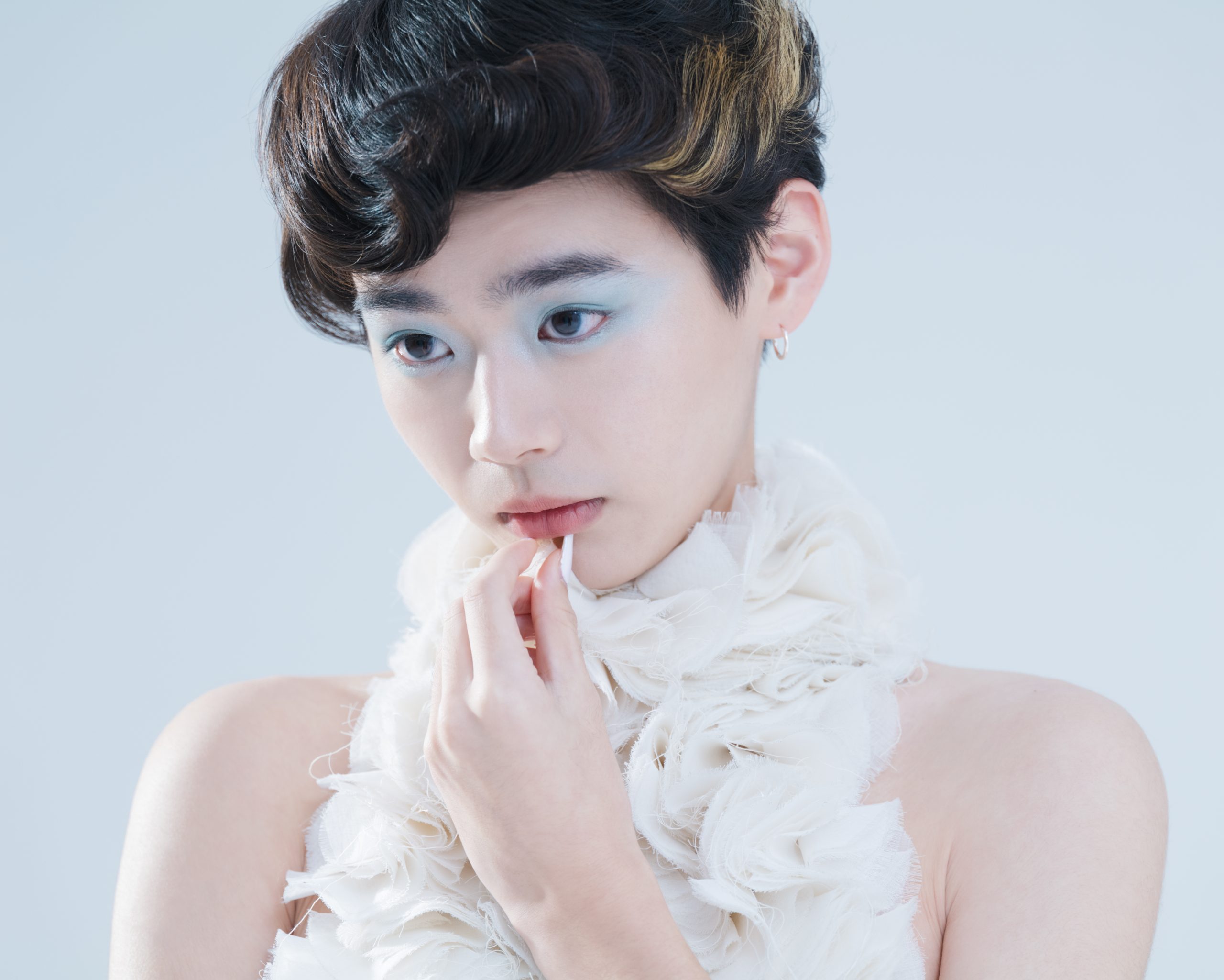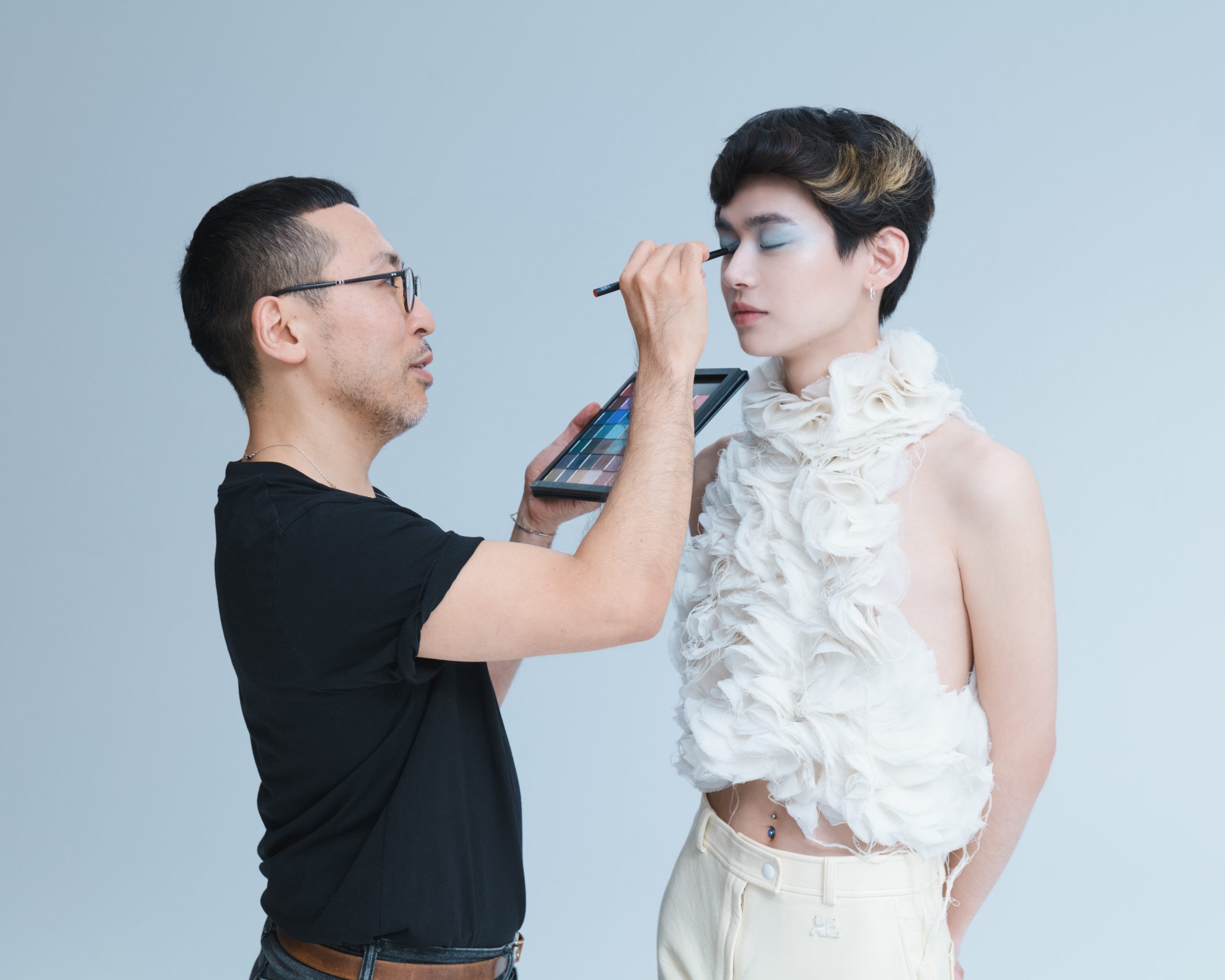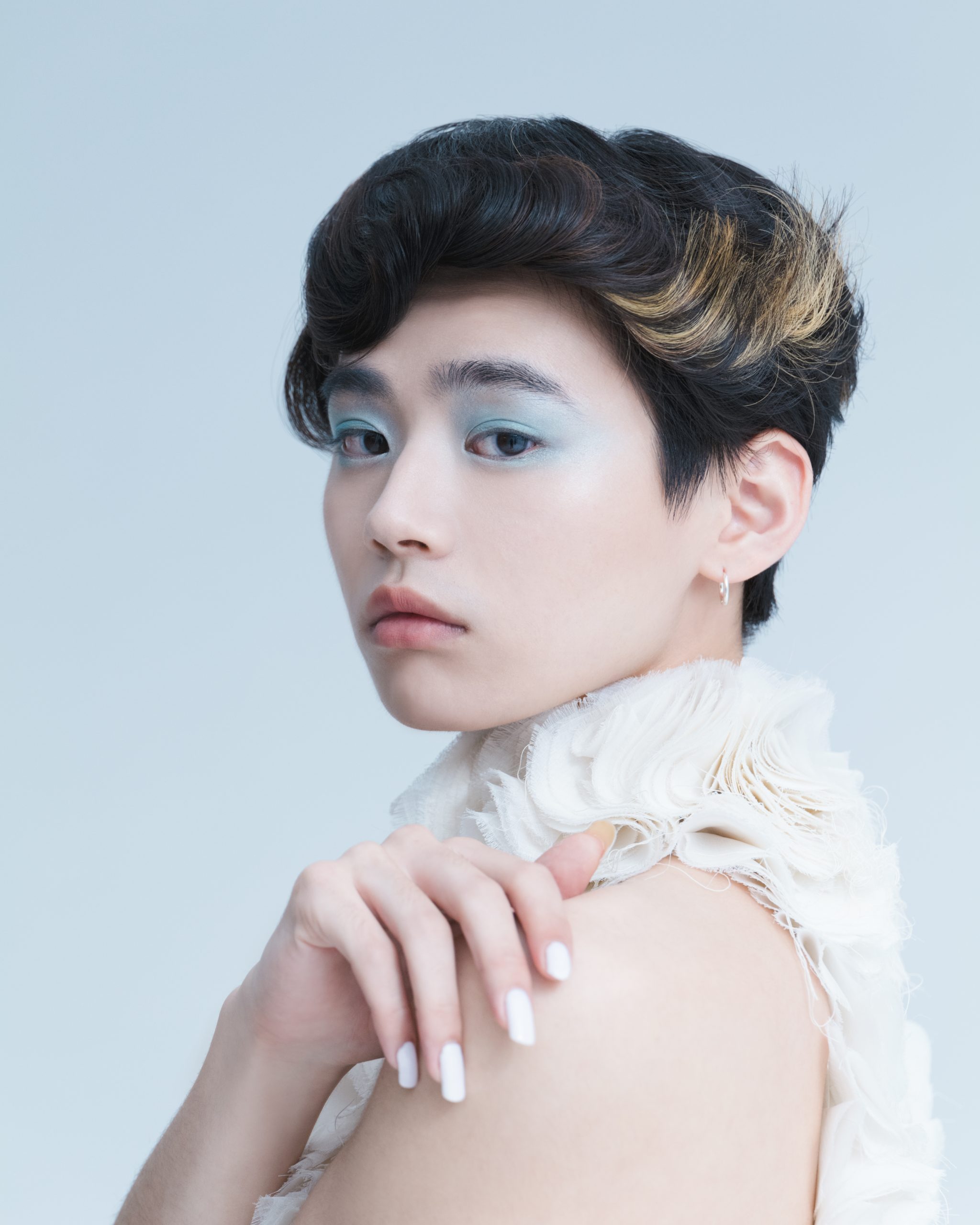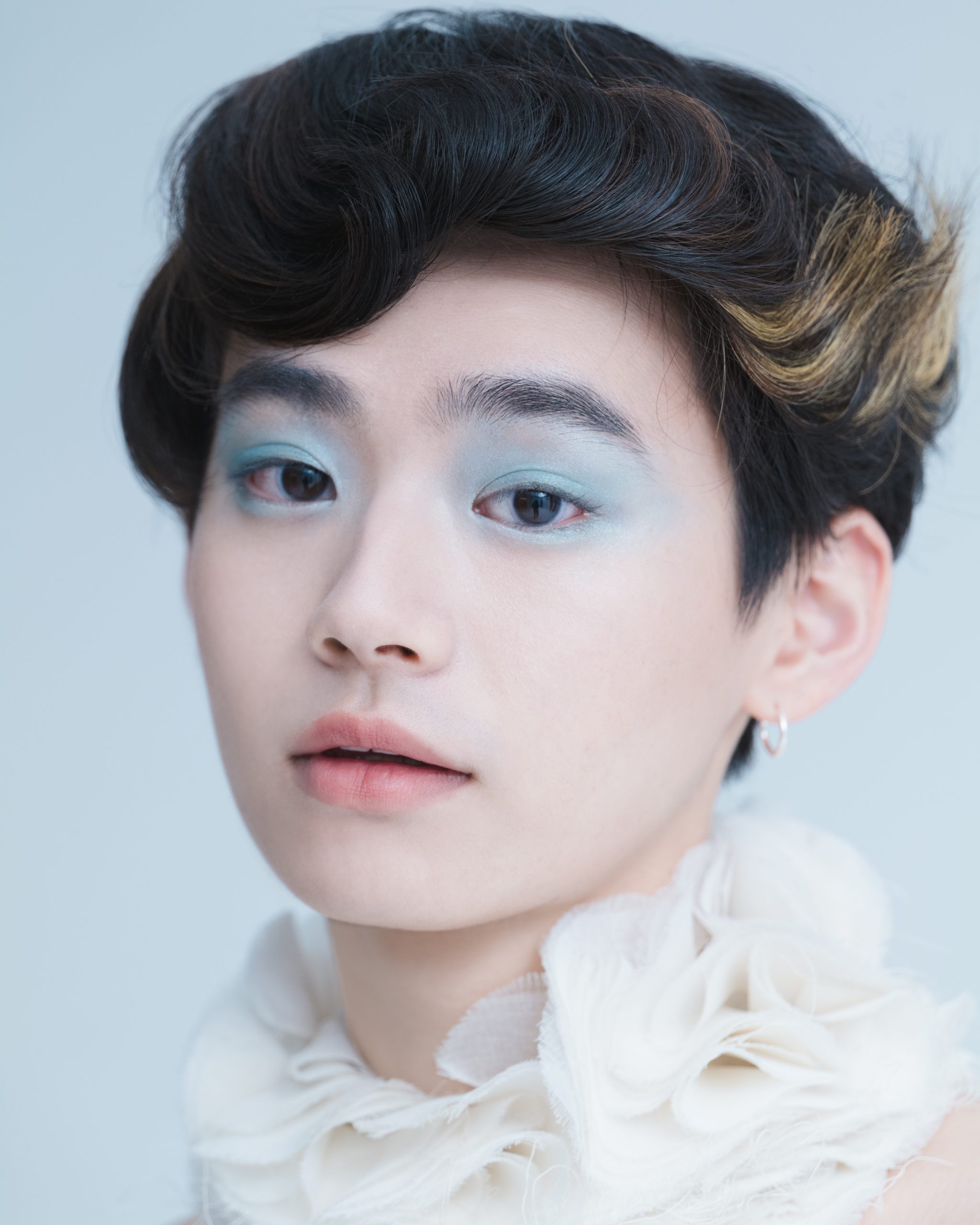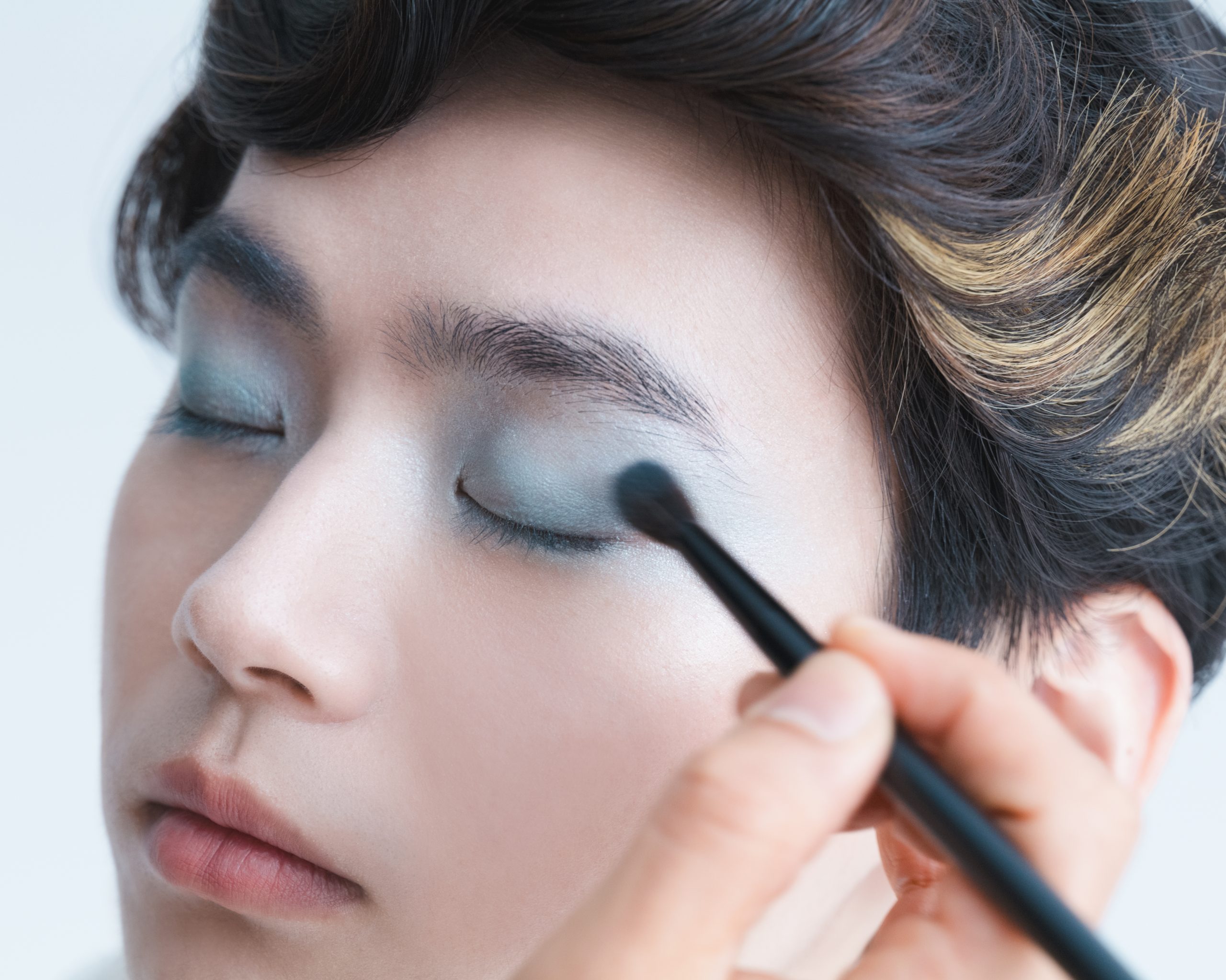 当初はアイシャドーをあまりつけないつもりでしたが、実際に今日お会いしてみて似合うだろうなと思い、水色のアイシャドーをポイントに選びました。水色ってそのままつけるとくすんだり、色が濃くでてしまうことがあるので、目元に光がきれいに入るように、パールのアイシャドーと混ぜながらクリアに発色させて、ナチュラルな透明感を演出しました。