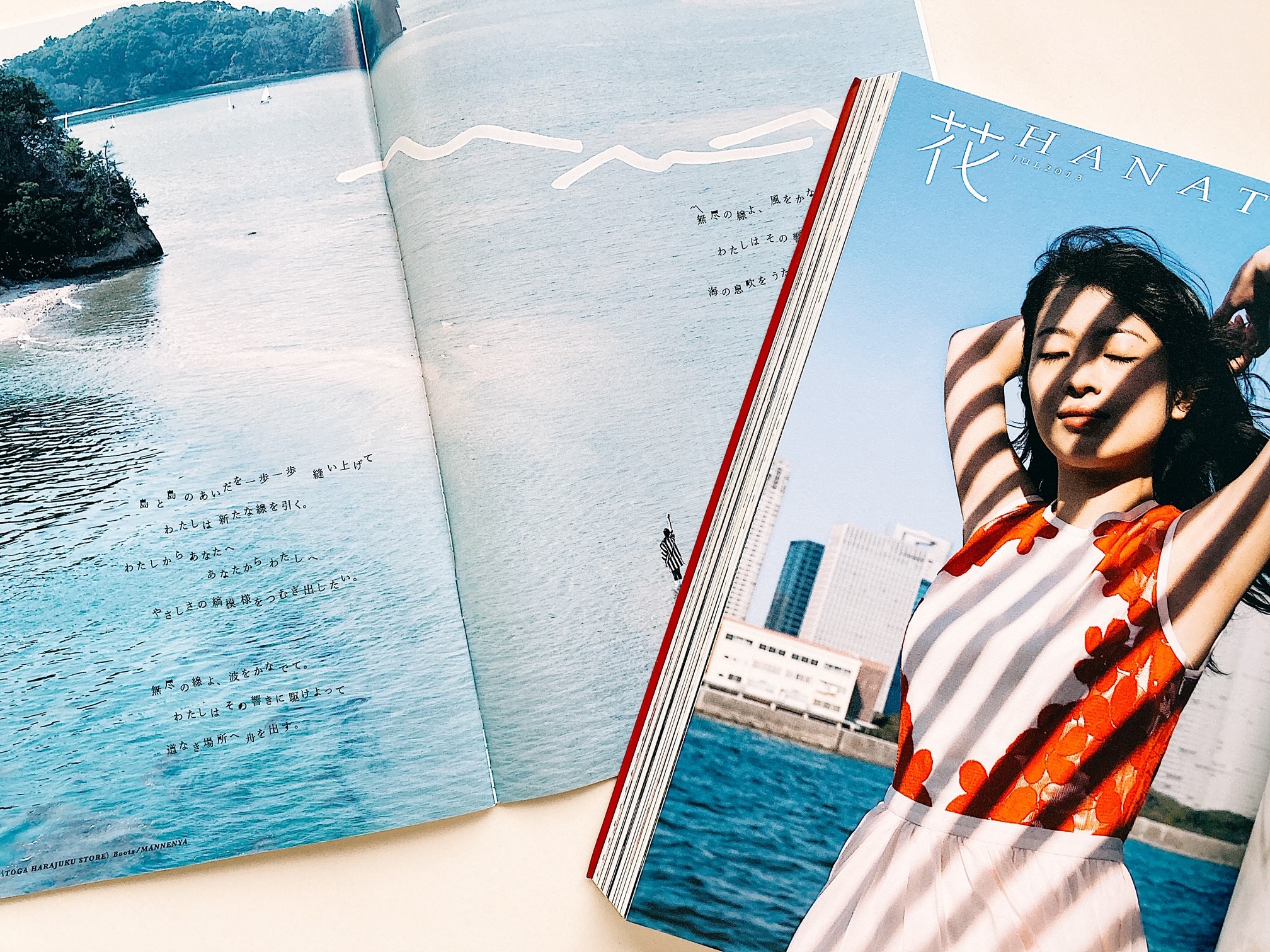 私が『花椿』で初めて詩のお仕事をしたのは七年前。紙の『花椿』2013年7月号の特集記事内だった。テーマは「かなでる」。ソニアパーク氏のスタイリング、ホンマタカシ氏撮影の写真に寄せて詩を紡ぐ企画。12行の中に「かなでる」と、「しまもよう」という語を入れて欲しい、という内容で(ファッションのテーマがボーダー、撮影地が小豆島という「しま繋がり」だったため)、どちらも自分の語彙には無い言葉だったので、とてもわくわくしながら、意匠を凝らした。