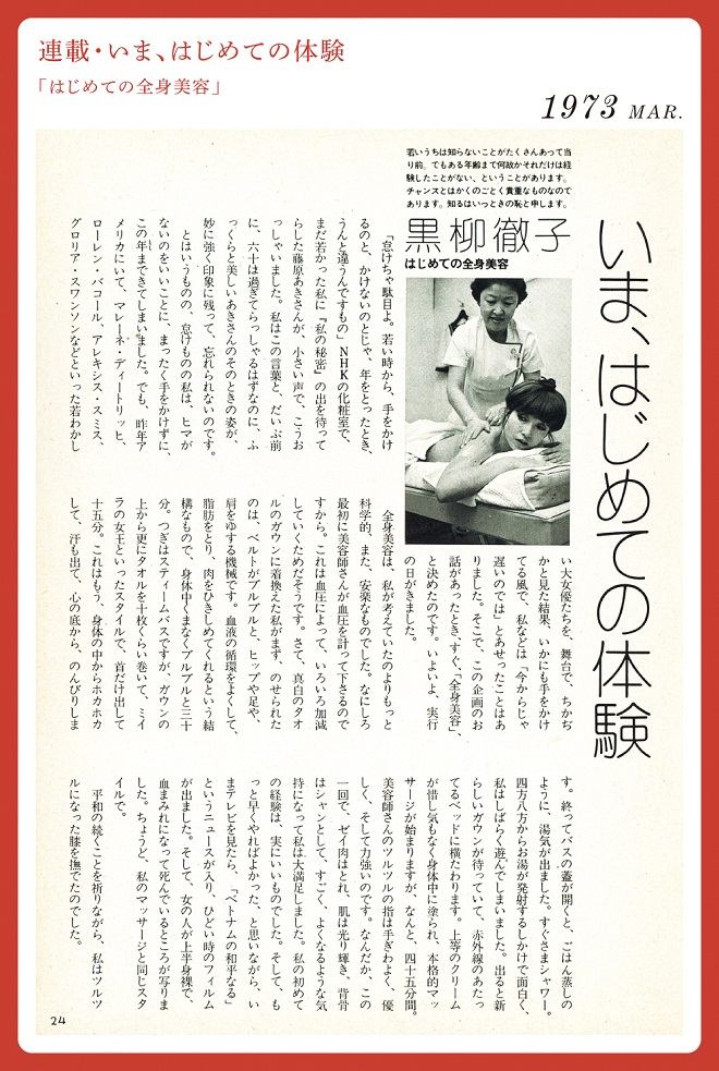 まずはじめに、好奇心旺盛な黒柳さんが「はじめて」のことを体験する連載です。