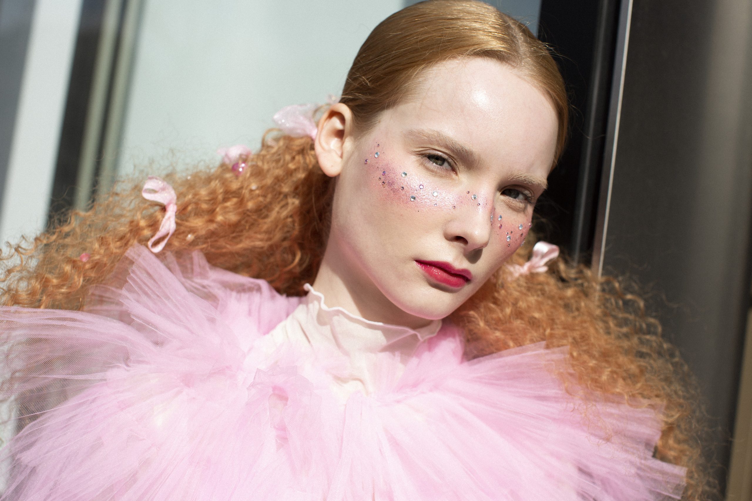 思い出の詰まったバレエシューズの絵画から広がる女性像をヘアメイクで表現しました。ピンクを基調としながらも、リップラインと背景を工夫することでドーリーさとクールさを両立させた作品です。