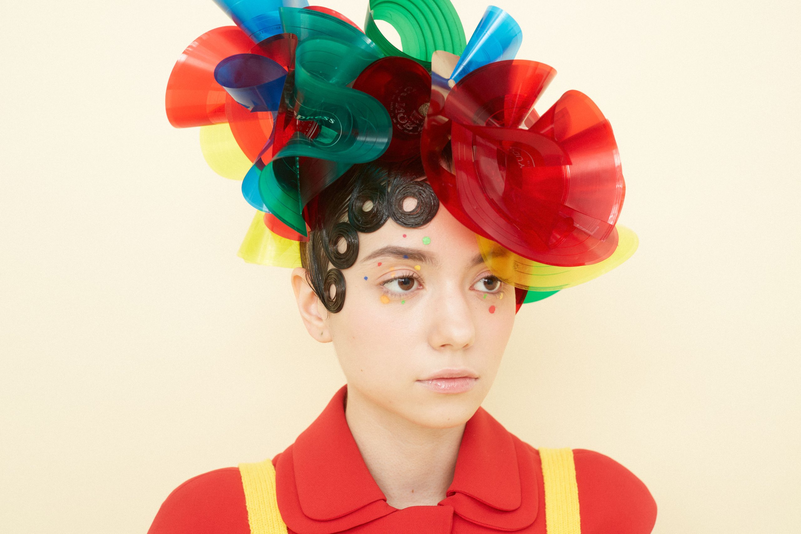 ポップな色使いと特徴的なドットのペイント、レコードでつくられたダイナミックかつ繊細に施されたヘッドピース、そしてくるりとカールさせた前髪に遊び心を添えて。幻想的でカラフルな世界観を清水さんのフィルターを通して表現しました。