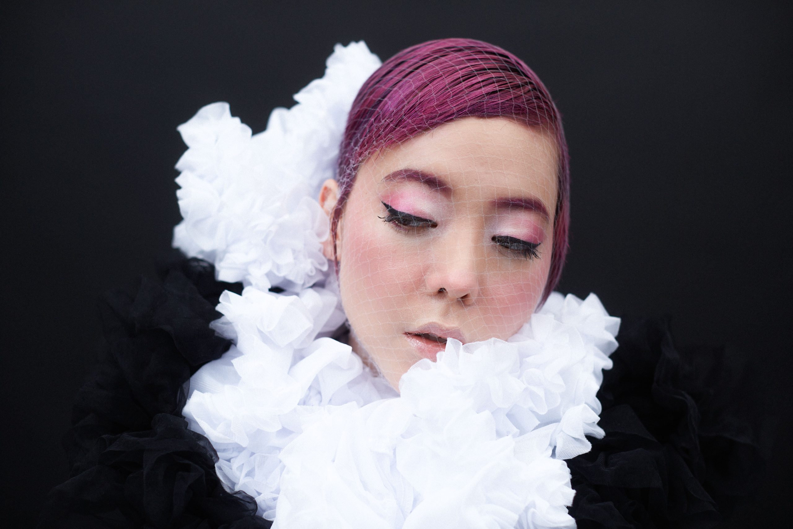 ライティングや視線の置き方でルタンスへのリスペクトを表現しながらも、ヘアとアイカラーでピンクを印象付けることによって、ミステリアスさとかわいらしさを併せ持つ洗練された女性像をつくりあげました。