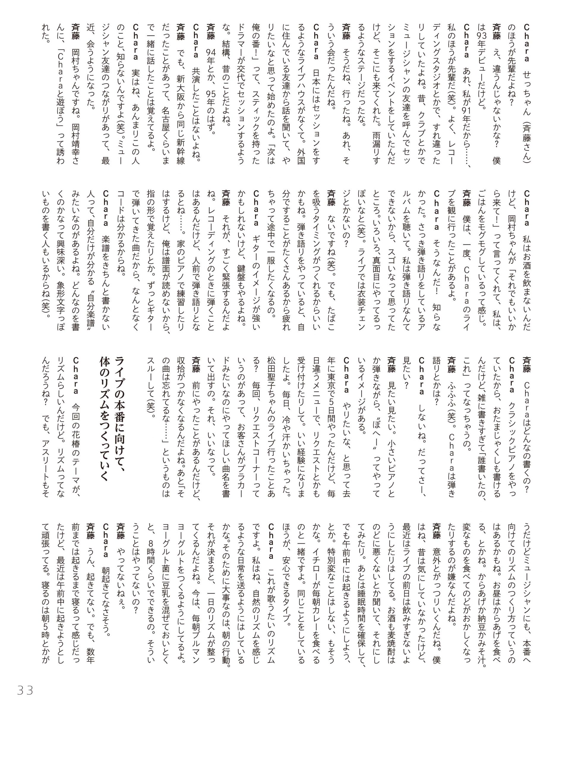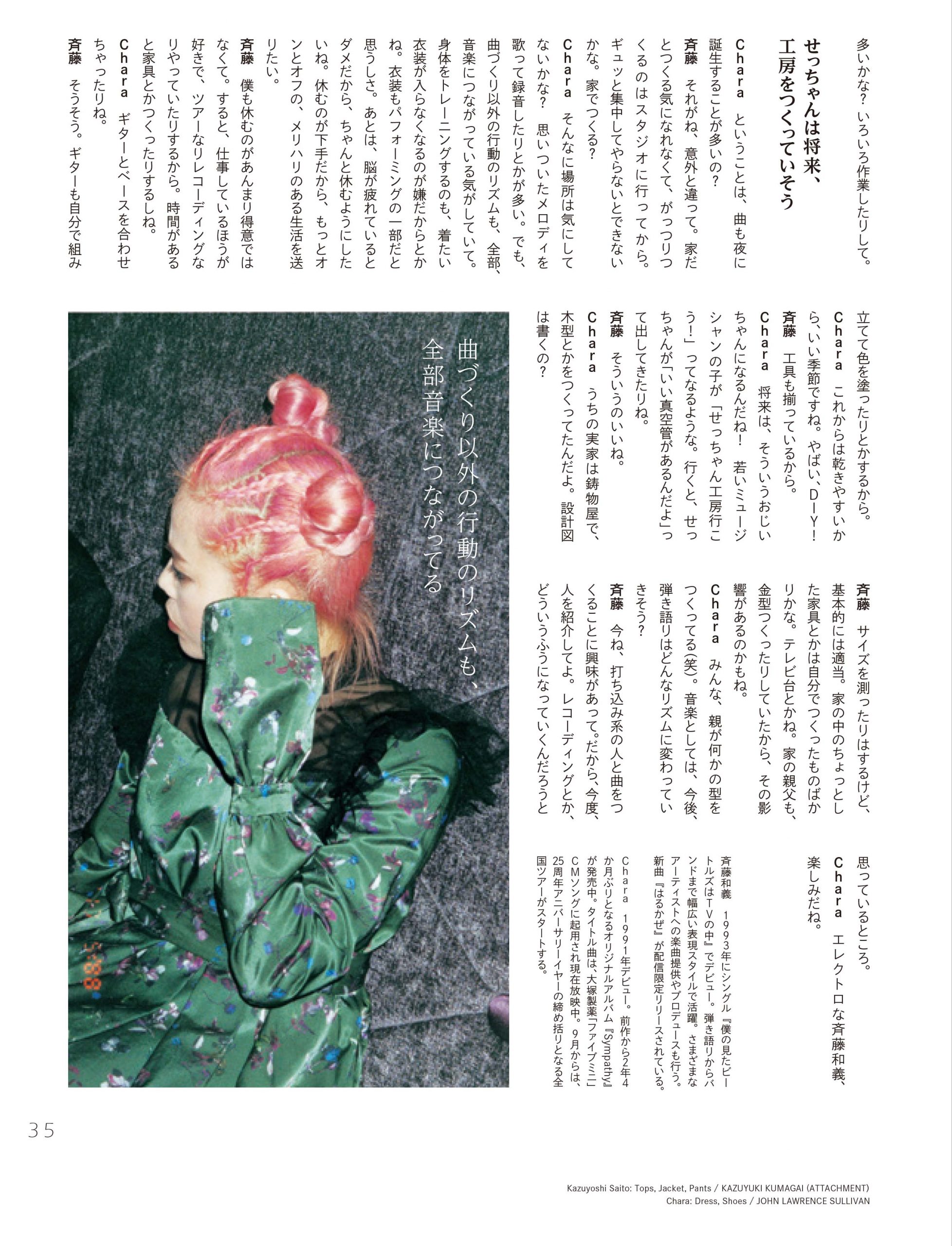 今回は、「美とリズム」を特集した2017年秋号(No.816)に掲載している、お客さま 斉藤和義さんの回です。Charaさんのごはん仲間でもある斉藤和義さん。二人の関係性から、いろいろなリズムのことまでを楽しくトークしています。