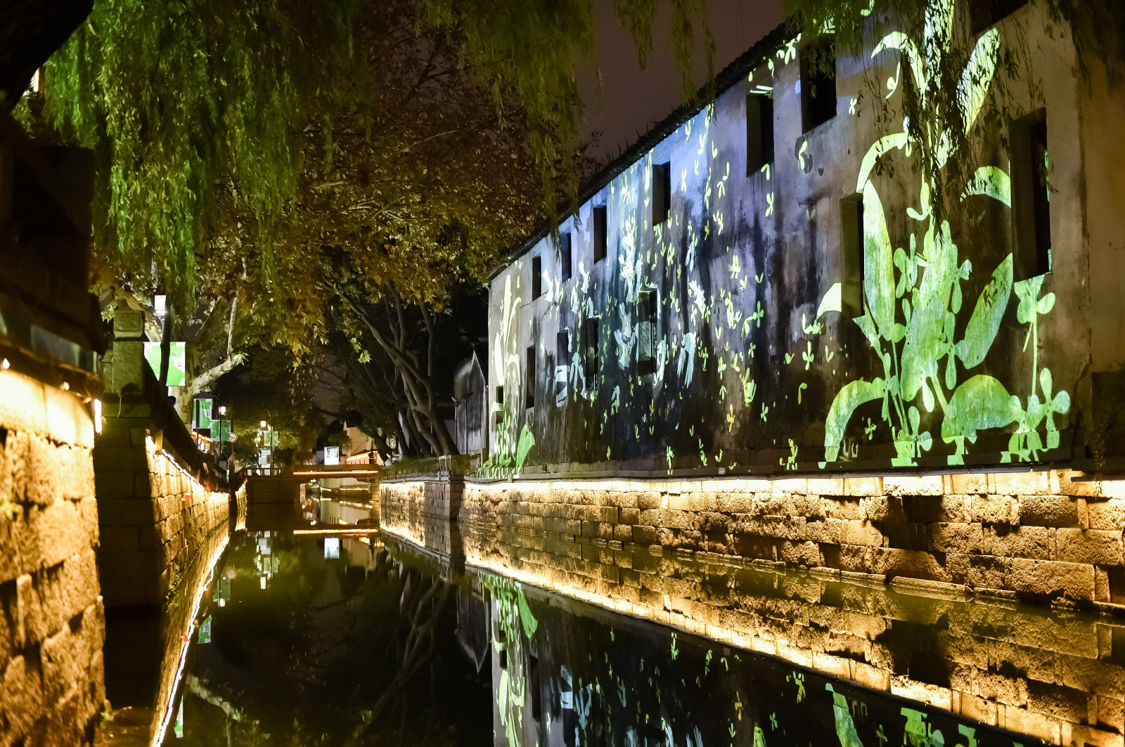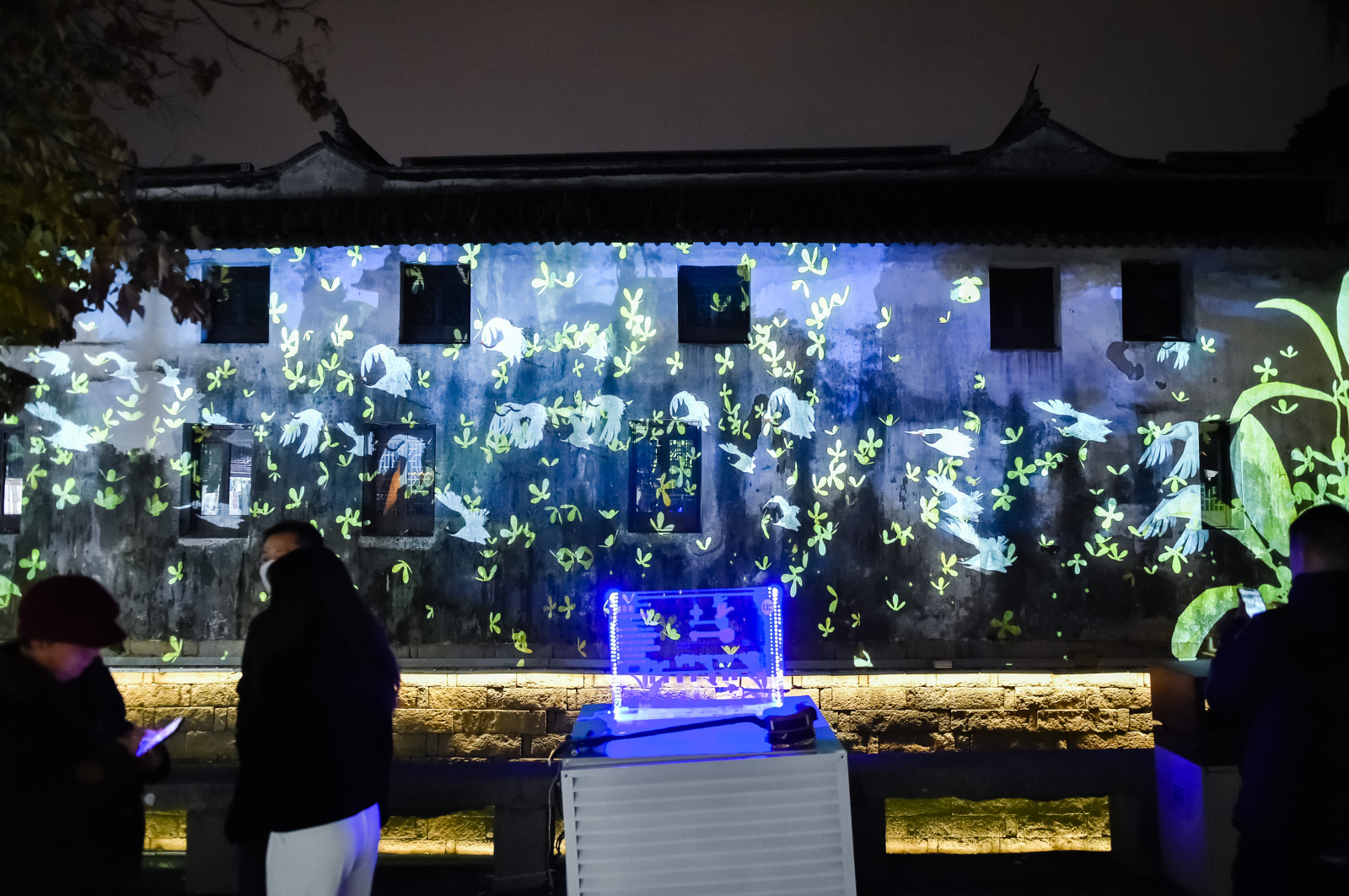 また、デザインウィークのイベントのひとつ、古い劇場の前で行われた「平江の夜」も心に残るものでした。この劇場は、現在は蘇州中国昆曲博物館として使われ、かつては山西省人の集会所でした。清朝時代の精巧な様式美に富んだ建築と現代的なLEDのスクリーンが、二百余年の時間と空間の間に強い対話を生み出していました。演奏に合わせ、蝶のモチーフとともに、新世代のニューメディアデザイナーたちがエプソンのプロジェクターを使ってインタラクティブな映像を平江対岸の古い家屋の壁に投影し、人々は魅惑的なデジタルアートを楽しみました。