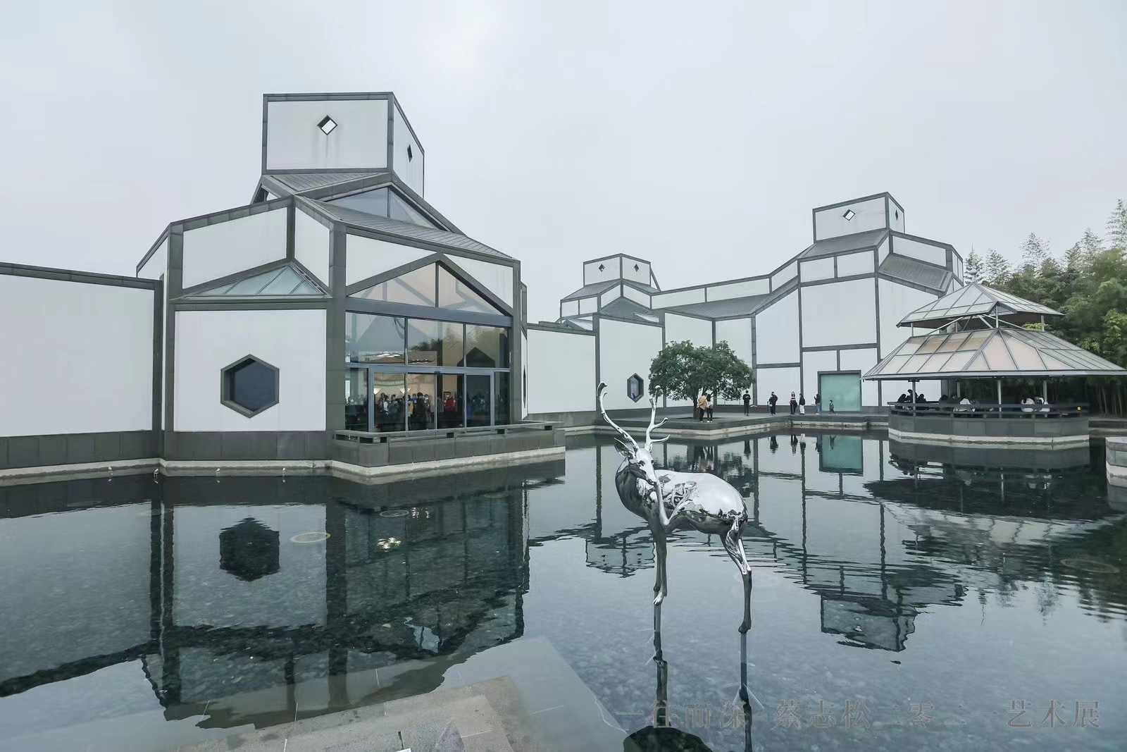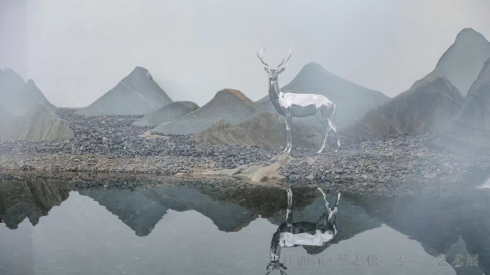 I.M.ペイ設計による蘇州博物館で行われていた、彫刻家の蔡志松(Cai Zhisong)による展覧会「一往而深(Going Deeper)」も印象的でした。蔡志松の代表作でもある梅花鹿の彫刻は、I.M.ペイがデザインした岩場の前をさまよい、水辺の向こう側をのぞむ姿で神話のような風景を描いていました。