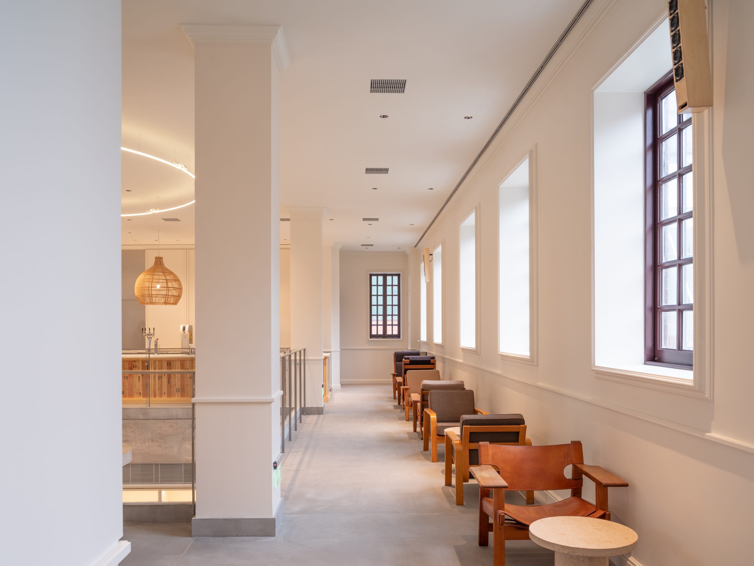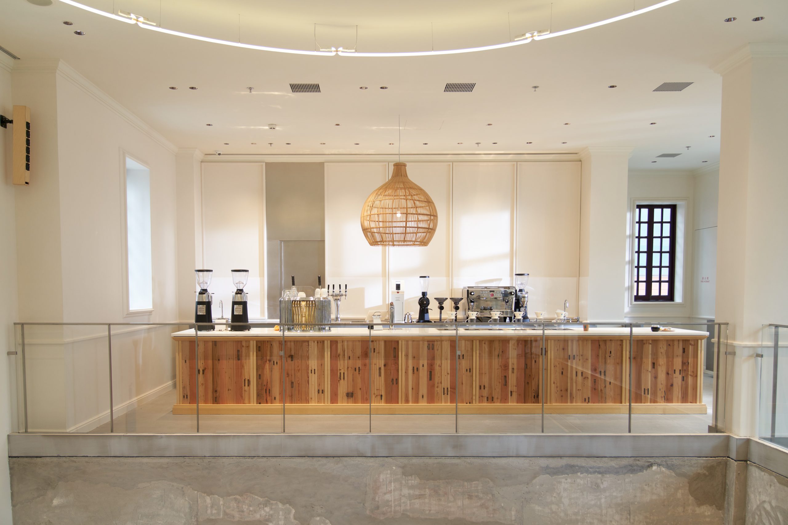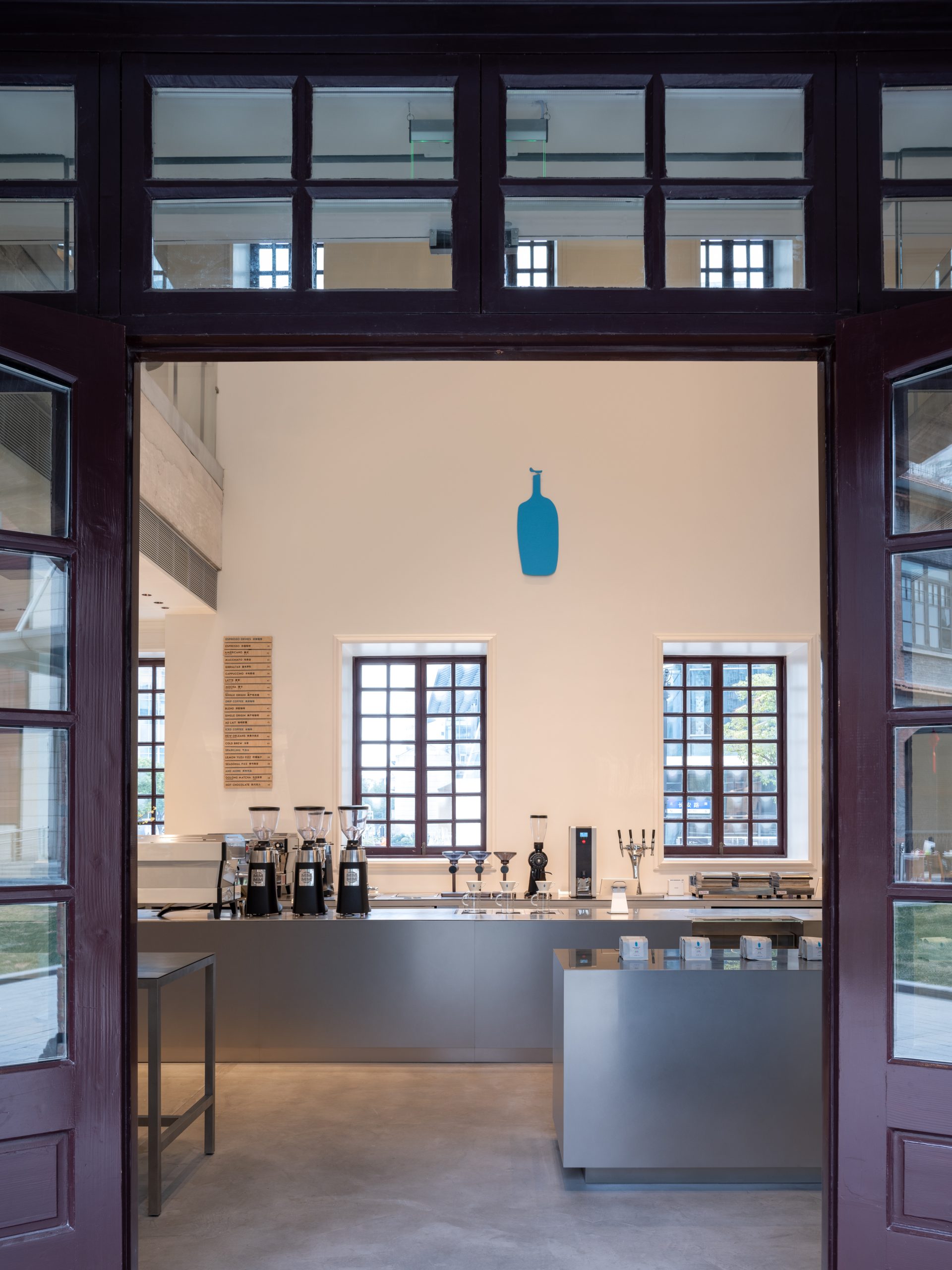Blue Bottle Coffeeの日本1号店は、銀座や表参道のような商業地区ではない清澄白河にオープンし、素朴なコミュニティといった雰囲気を漂わせていました。上海1号店は蘇州河北岸の新ビジネスエリアにあり、建物は1926年竣工のかつての製粉所の職員宿舎で、現在は歴史的保存建築に指定されています。約100年の歴史を持つ、上海の典型的な赤とグレーのレンガ造りの古建築に、アメリカ・オークランド発の青いボトルが掛けられました。