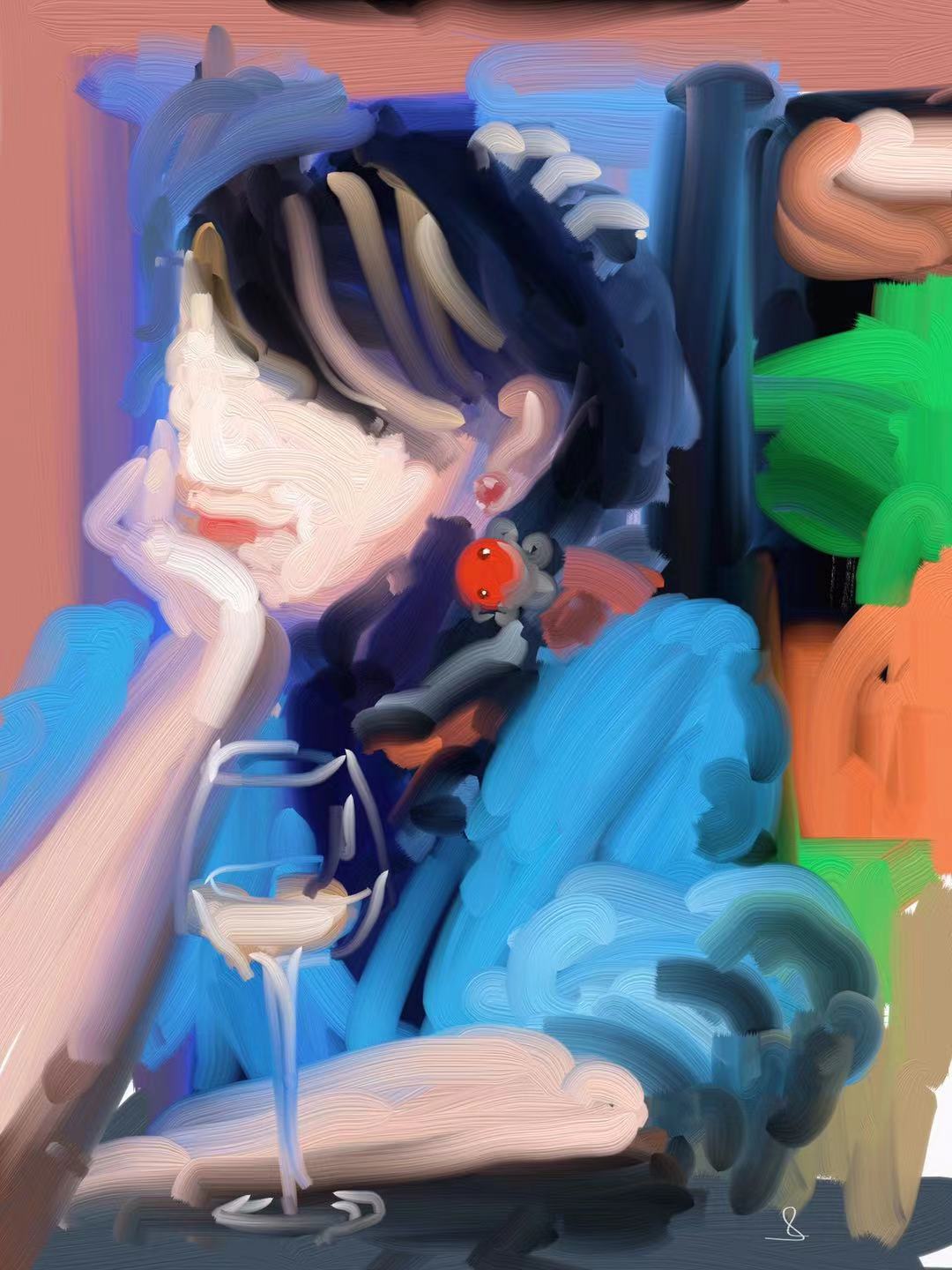 1960年代生まれの典型的な上海の文芸中年であるサイモンに僕が最初に会ったのは、あるカルチャーイベントでした。彼はもともとインターナショナルな広告代理店に勤めており、2016年からSNSにデジタル絵画をアップし始めました。彼の最初の作品は、友達と一緒にご飯を食べに行き料理が来るのを待っているときに、目の前にいる女性、コーヒーカップ、ナプキン、テーブルの上にあるさまざまなものをスマホ上で描いたもので、とても自由で優雅な趣があります。何がきっかけで彼はこのような絵を描くようになったのでしょう?