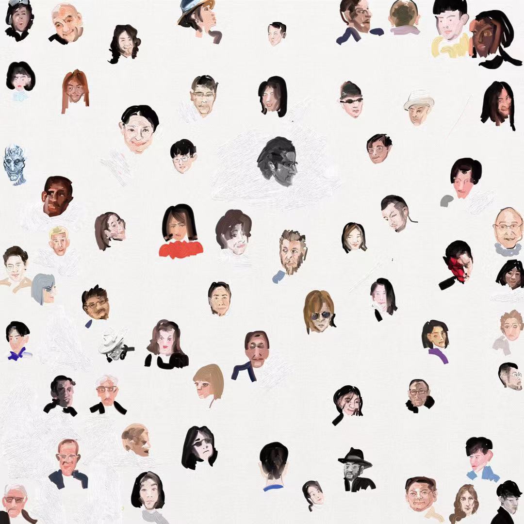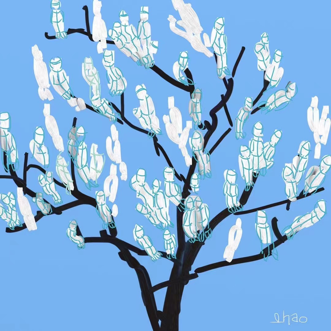 上海でオミクロン株の流行が始まった時期には、ちょうど街頭の木蓮が満開になり、彼はそれを描きました。よく見ると木蓮は白い防護服を着て忙しく働く医療従事者の集団になっています。長い期間、人に接触できなかったときは、家にこもってWeChatでつながる友人たちのアバター画像を描きました。