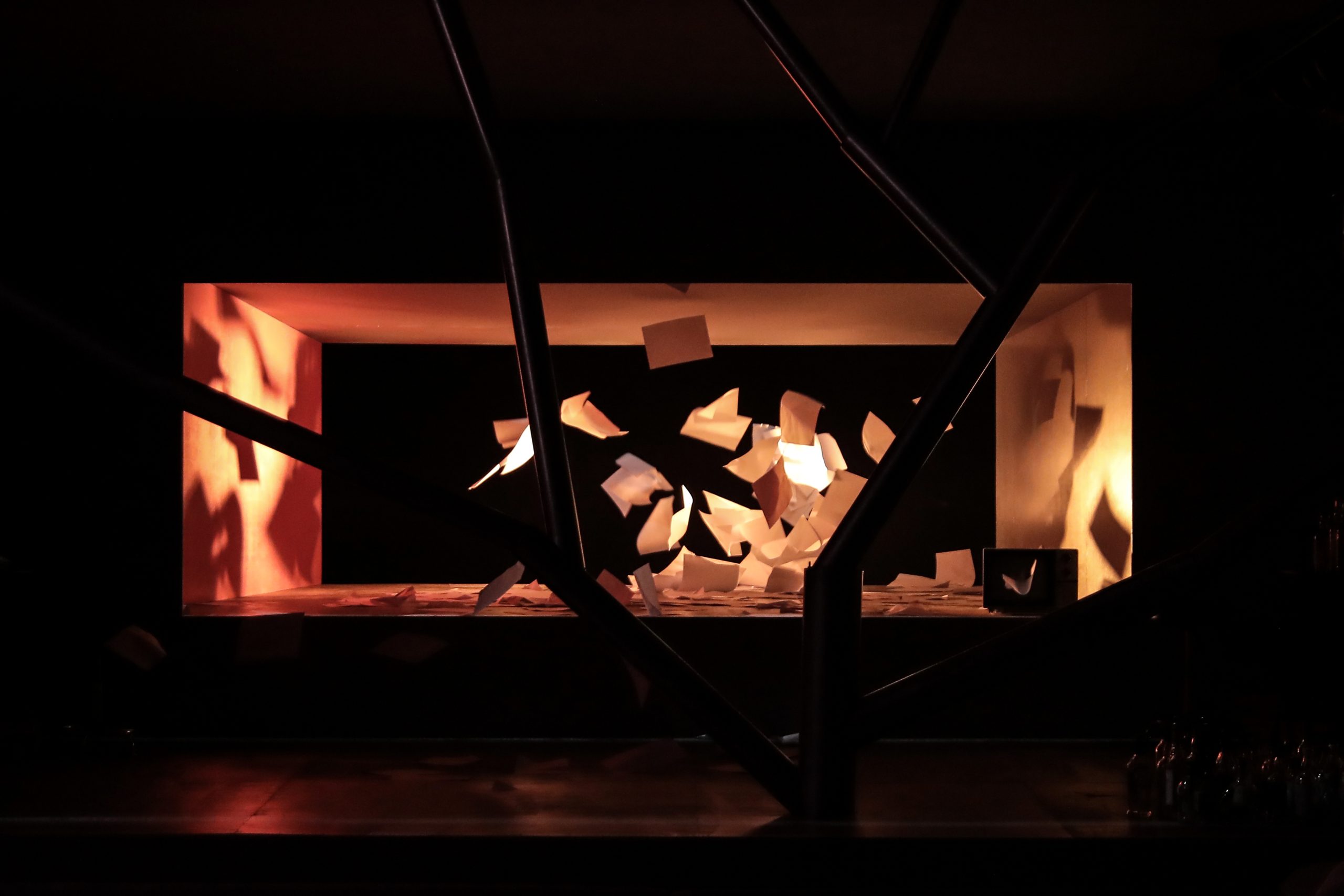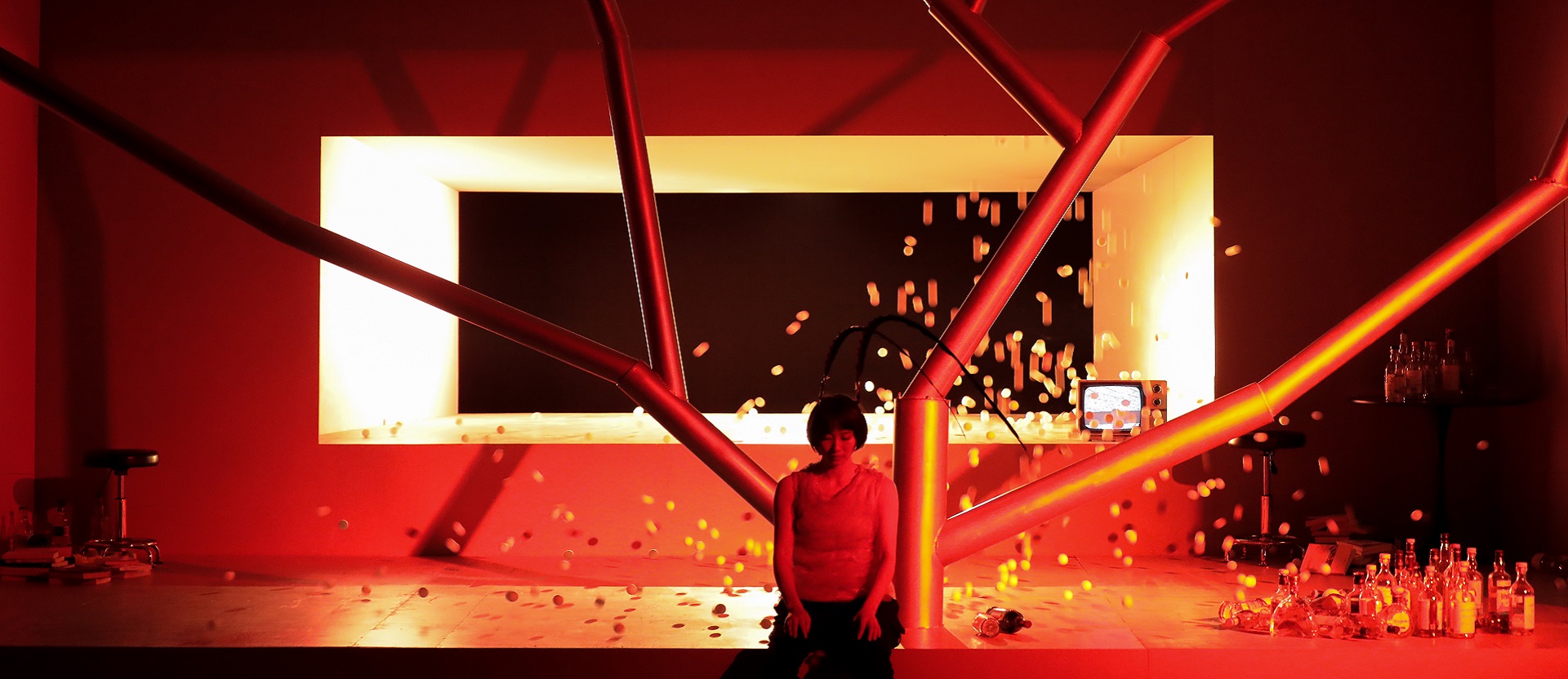 舞台は三層に分かれたロフト式アパートメント。冷たいコンクリートグレーの空間の中央には、葉がなく枝だけの巨木が唯一の装飾のように静かに林立。その場の雰囲気を瞬時に変化させるのは、鮮紅色の電灯、黄昏色の夕陽、殺伐とした白い稲光。10人掛けの長いソファ、洗濯機、散乱する空の酒瓶は、耐え難いほどの孤独を象徴しています。