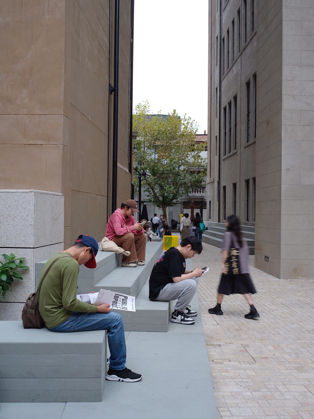 建物の間にベンチのように配置された多数のグレーのコンクリートはとても心地よい質感で、ぜひ座ってみることをおすすめします。