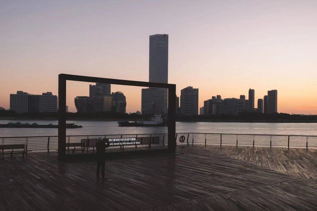 西岸美術館北広場には,現代美術家の郭熙(Guo Xi)による「無尽影院 A Film Endless」という作品が登場。一見するとただのシンプルな黒い枠なのですが、その向こうを流れる黄浦江の水面を画面とし、ポエティックな言葉がLED字幕で映し出されます。これは上海という都市をPRするのにとても相応しい表現だと思いました。