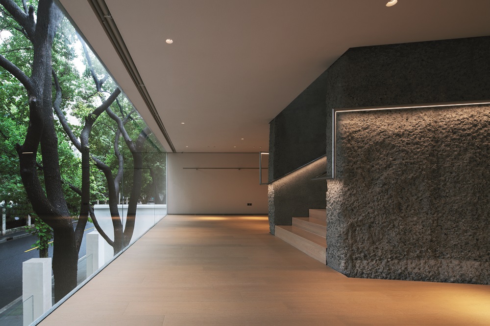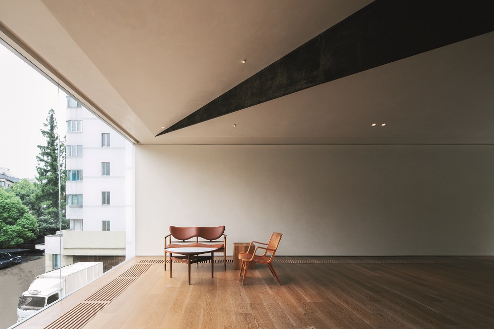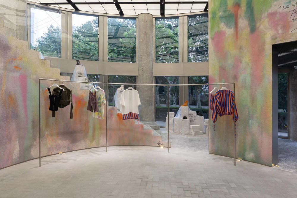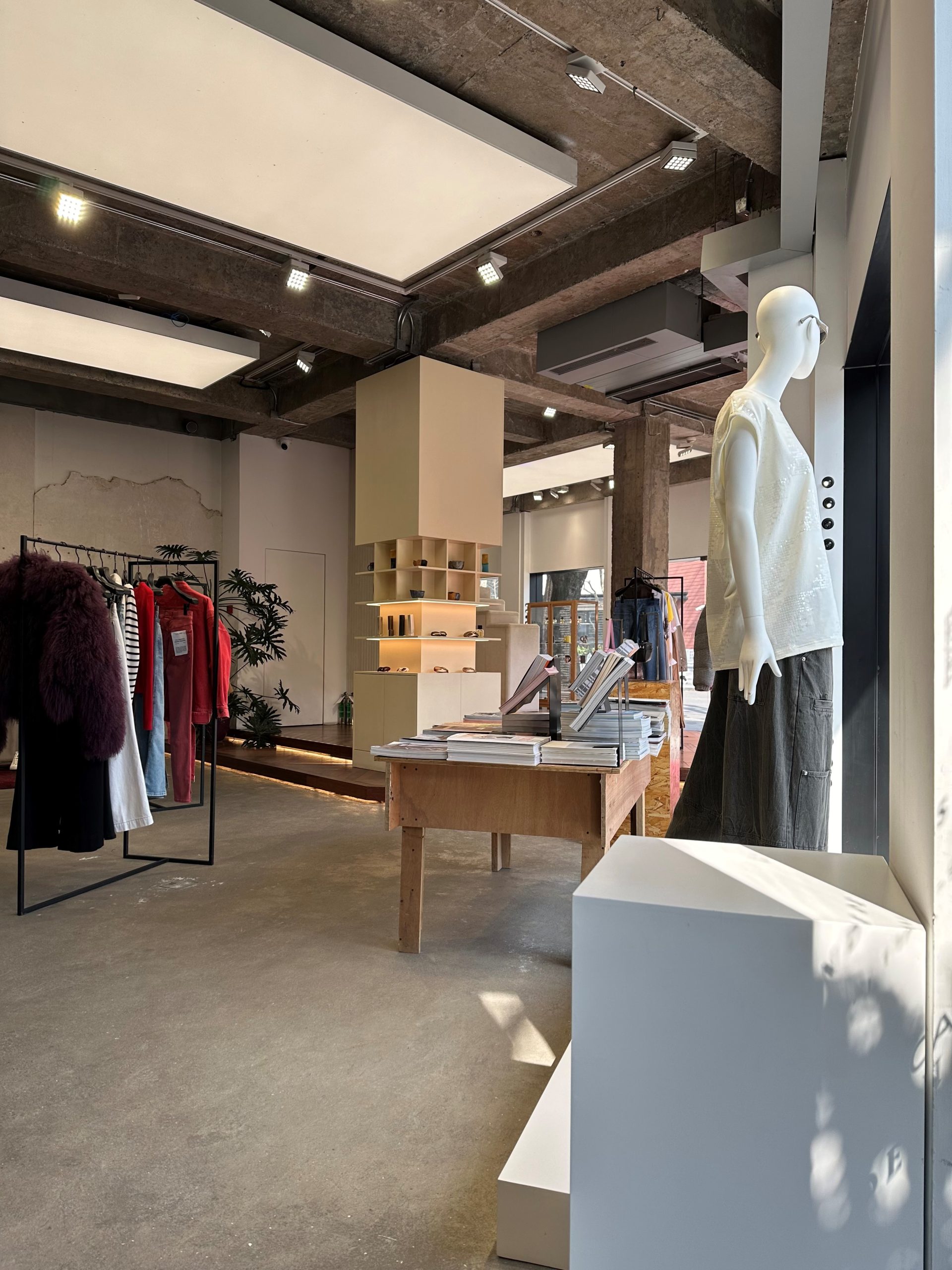 まずはシンプルなデザインが人気のファッションブランド「Yearly Plan」です。店舗は新進気鋭の建築事務所dongqi Designによってデザインされた淡い灰色のモダンなコンクリートと大きなガラス面で構成された外観が特徴的。3階建ての店内も、粗いコンクリート、軽量なアルミニウム、温かみのある木材が巧みに組み合わせられ、味のあるアンティーク家具とともに洗練された雰囲気を放っています。